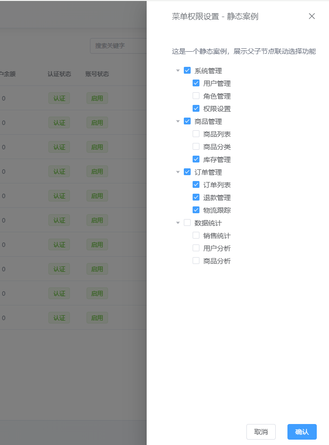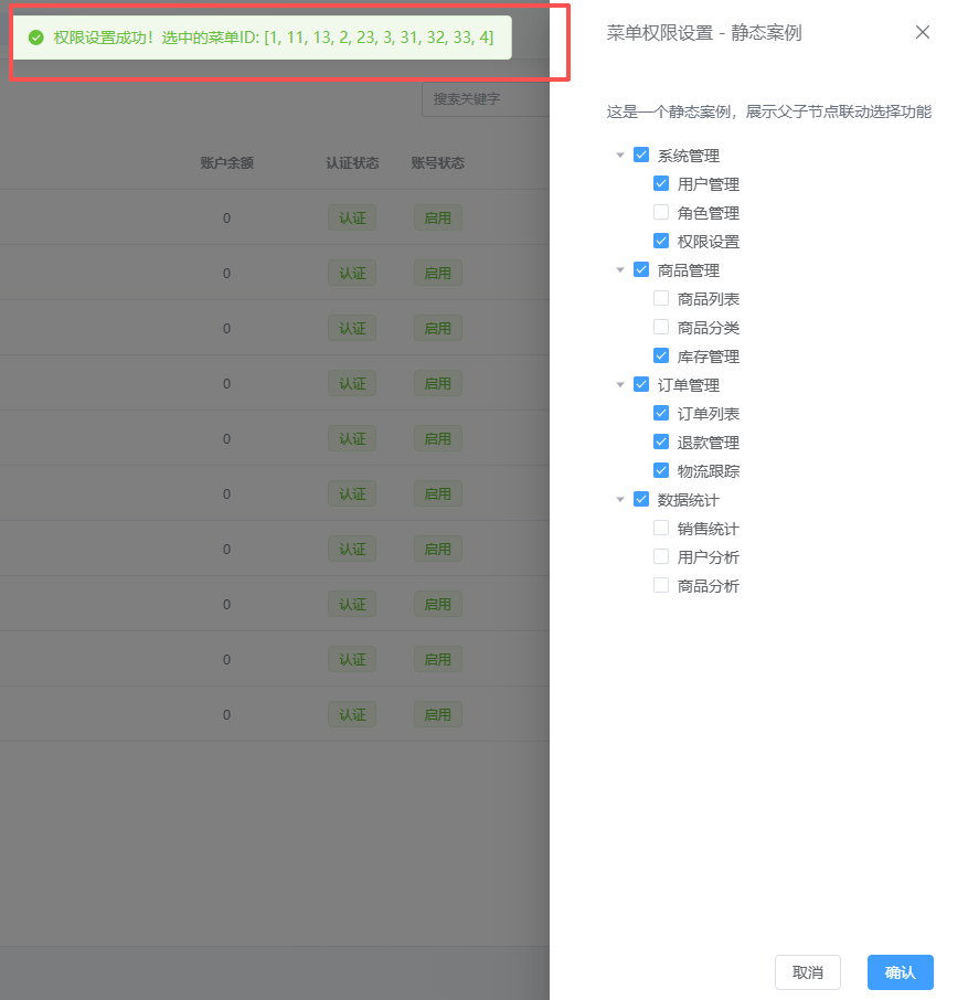 };const submitForm = () => {updateSelectedMenuIds();ElMessage.success(`权限设置成功!选中的菜单ID: [${selectedMenuIds.value.join(', ')}]`);console.log("选中的菜单ID:", selectedMenuIds.value);