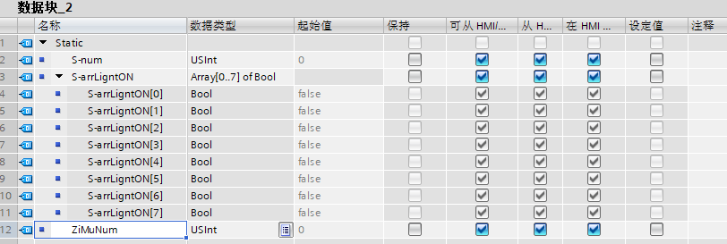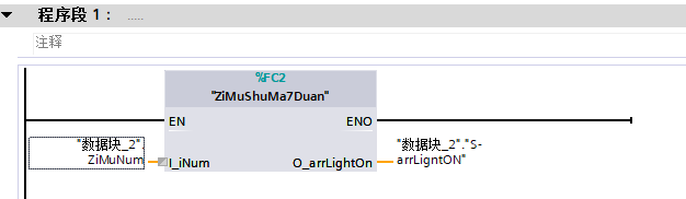 "数据块_2".ZiMuNum 的值对应FC块中0-28,0-28各对应一个二进制数据,二进制数据的0和1对应七段数码管的灯管亮灭。