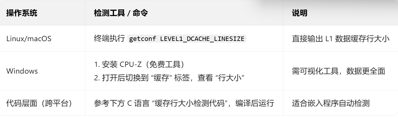 优化前需先确认目标环境的缓存行大小,避免按 “默认 64 字节” 优化出现偏差。以下是不同系统的检测工具 / 命令: