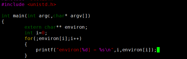 我们首先要声明<unisted.h>这个头文件,接着在main函数中要声明这个变量,最后使用的是方法就和上面第一种方式中的char* env[]数组是一样的,毕竟environ就指向指向环境变量表嘛。
