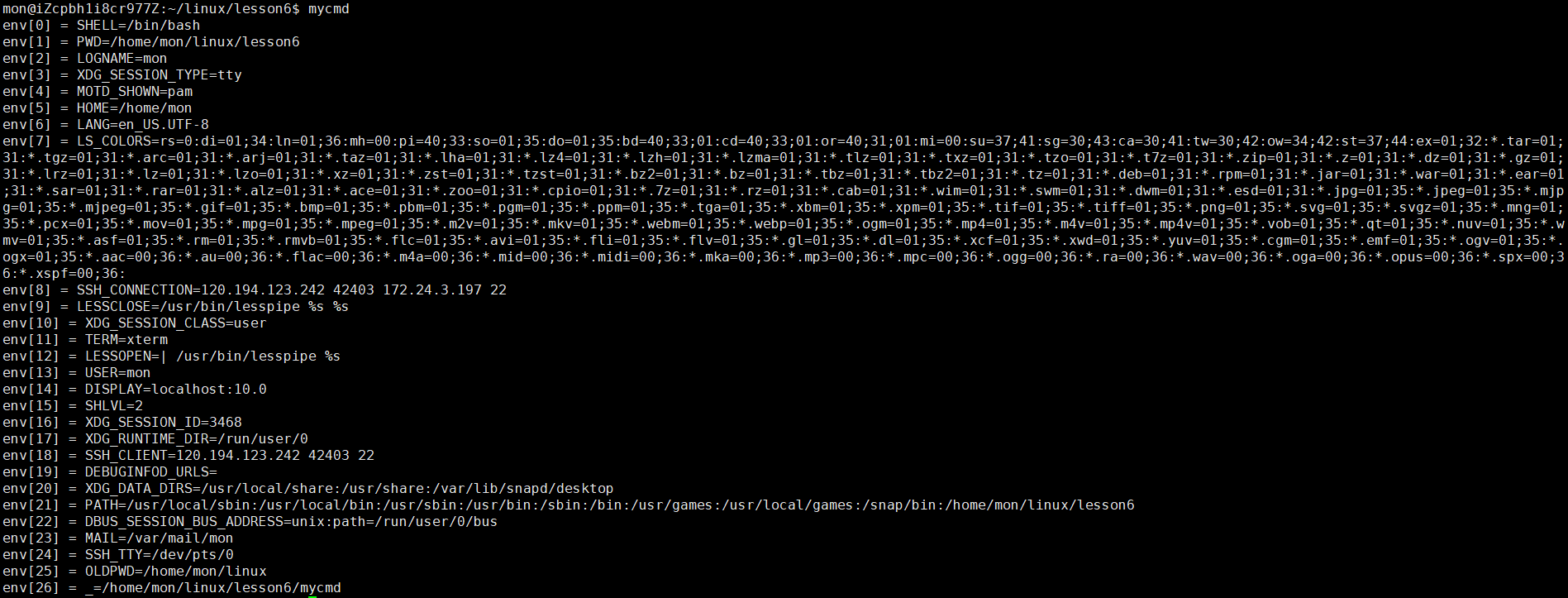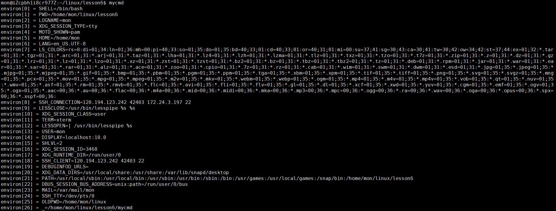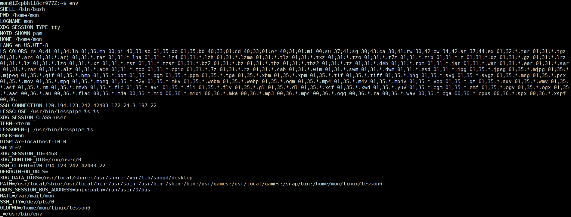 里面的环境变量还有很多,像LS_COLORS,我们再执行ls指令时,会看到展示出的文件有各种颜色,这个功能正是通过获取这个环境变量来实现的。并且我们看到这个环境变量后面跟了一长串的内容,这一长串内容就是定义在LS_COLORS 时,不同文件类型、扩展名、权限位在终端中显示的颜色方案,通常这个变量由dircolors命令从~/.dircolors或系统默认配置生成。