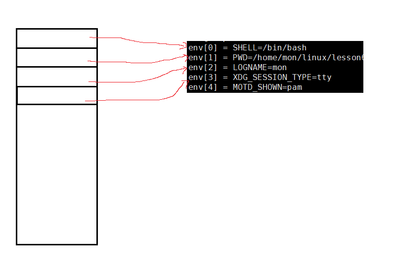 我们上面只是介绍了main函数的前面两种参数,其实还有第三个参数char* env[],这个和char* argv[]都为指针数组,都是指向了一个一个字符串,而这些字符串就是环境变量的K=V形式的字符串,我们用图来看一下: