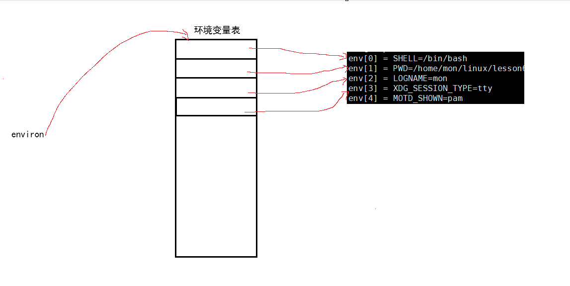 里面的SHELL=/bin/bash就是K=V形式,数组中保存的都是这种形式的字符串,而char* env[]数组中的内容是从环境变量表中获取的,就和char* argv[]数组是从命令行参数表中获取内容是一样的。