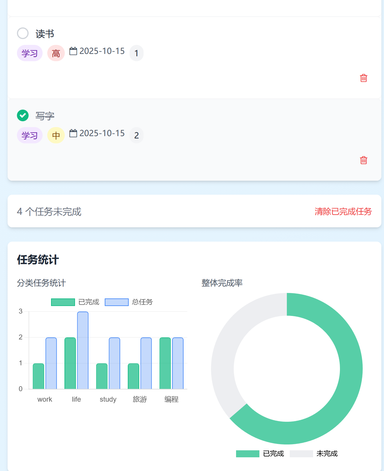 用 Chart.js 生成两个图表:柱状图(分类任务统计) 和环形图(整体完成率),支持深色模式配色适配。