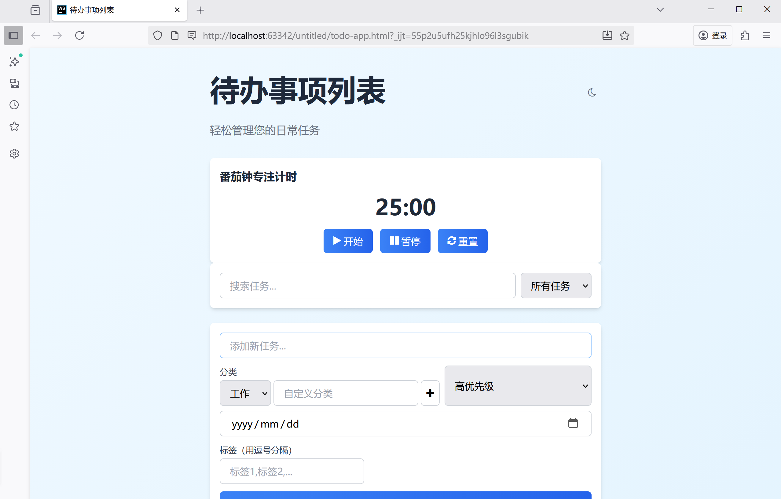通过以上开发,最终实现了一个 “功能完整、体验流畅、轻量易用” 的待办事项列表工具,覆盖了从基础任务管理到进阶时间管理、数据统计的全流程需求。