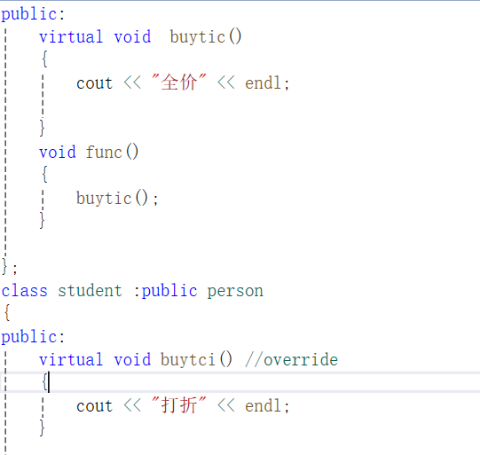 public:virtual person* buytic(){cout << "全价" << endl;return nullptr;}void func(){buytic();}};
