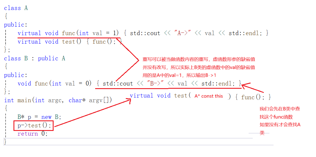 public:virtual void func(int val = 1){ std::cout<<"A->"<< val <<std::endl;}virtual void test(){ func();}