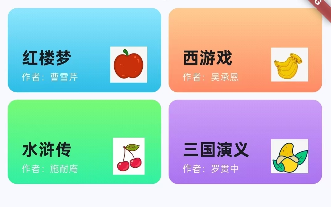 }){return Container(//容器基础样式height: 85,width: 155,decoration: BoxDecoration(borderRadius: BorderRadius.circular(10),//圆角gradient: LinearGradient(//垂直渐变begin: Alignment.topCenter,end: Alignment.bottomCenter,colors: colors),),//使用Material Ink InkWell 组合 点击波纹效果//点击效果实现child: Material( //提供材质color: Colors.transparent,child: Ink(//墨水效果容器child: InkWell(//实际产生波纹效果的组件borderRadius: BorderRadius.circular(10),onTap: callback,//点击时传入的回调函数//内部布局结构child: Padding(padding: const EdgeInsets.only(left: 15,top: 12.5,bottom:10,right:15),child: Column(crossAxisAlignment: CrossAxisAlignment.start,//子组件左对齐children: [const Expanded(child: SizedBox()),//弹性撑开空间,Expanded会占据所有可用空间,将后面的Row推向底部Row(mainAxisAlignment: MainAxisAlignment.spaceBetween,//两端对齐children: [//左侧文本列Column(crossAxisAlignment: CrossAxisAlignment.start,children: [Text(title,style: const TextStyle(fontSize:18,fontWeight: FontWeight.bold),),//使用传入的文字1Text(subtitle,style: const TextStyle(color: Colors.white,fontSize: 10),),//使用传入的文字2],),//右侧图标Image.asset(icon,width: 40,height: 40,),//使用传入的图片1],),],),),),),),);}//UI构建@overrideWidget build(BuildContext context) {return Scaffold(body: Center(child: Column(mainAxisAlignment: MainAxisAlignment.start,children: [Expanded(child: Padding(padding: EdgeInsets.symmetric(horizontal: 10),child: GridView.count(crossAxisCount: 2,//固定列数crossAxisSpacing: 8,//列间距mainAxisSpacing: 8,//行间距childAspectRatio: 1.823,//子项的宽高比children: [buildItem(icon: "assets/images/apple.png",title: "红楼梦",subtitle: "作者:曹雪芹",colors: const [Color(0xFF8EE6FE),Color(0xFF2BBDE7)],callback: (){Fluttertoast.showToast(msg: "你点击了红楼梦!!!");}),buildItem(icon: "assets/images/banana.png",title: "西游戏",subtitle: "作者:吴承恩",colors: const [Color(0xFFFFCC91),Color(0xFFFF8a65)],callback: (){Fluttertoast.showToast(msg: "你点击了西游记!!!");}),buildItem(icon: "assets/images/cherry.png",title: "水浒传",subtitle: "作者:施耐庵",colors: const [Color(0xFF77FA76),Color(0xFF31F0A3)],callback: (){print("点击事件触发");Fluttertoast.showToast(msg: "你点击了水浒传!!!",);}),buildItem(icon: "assets/images/mango.png",title: "三国演义",subtitle: "作者:罗贯中",colors: const [Color(0xFFCC9EF7),Color(0xFFA973F0)],callback: (){Fluttertoast.showToast(msg: "你点击了三国演义!!!");}),],),),),],),),);}}