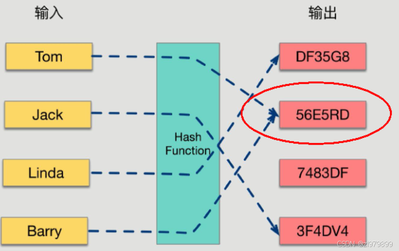 - 散列函数的输入和输出不是唯一对应关系的,如果两个散列值相同,两个输入值很可能是相同的,但也可能不同,这种情况称为“散列碰撞(collision)”