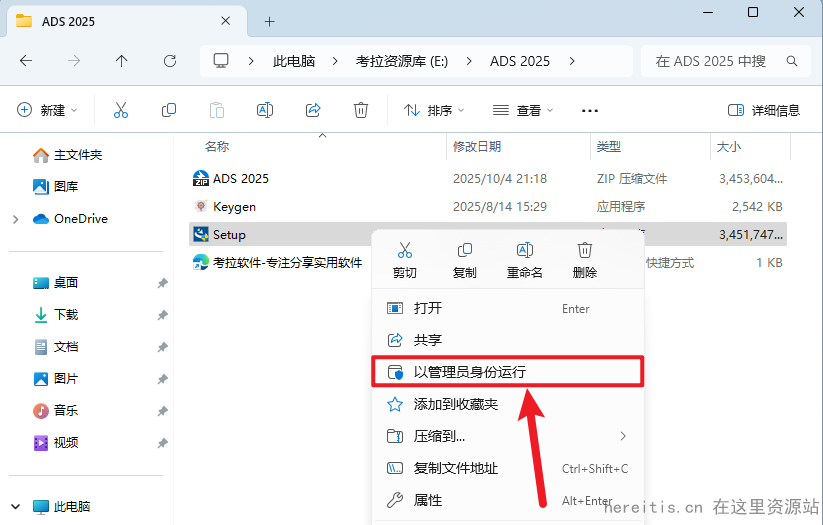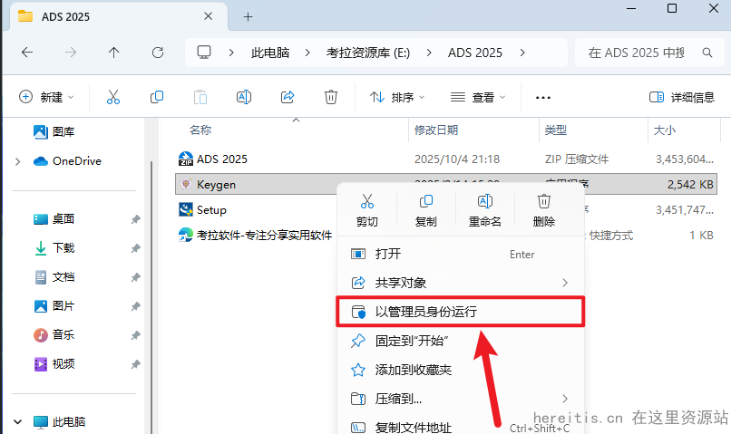16.打开安装包解压后的【ADS 2025(64bit)】文件夹,鼠标右击解压出来的【Keygen】选择【以管理员身份运行】