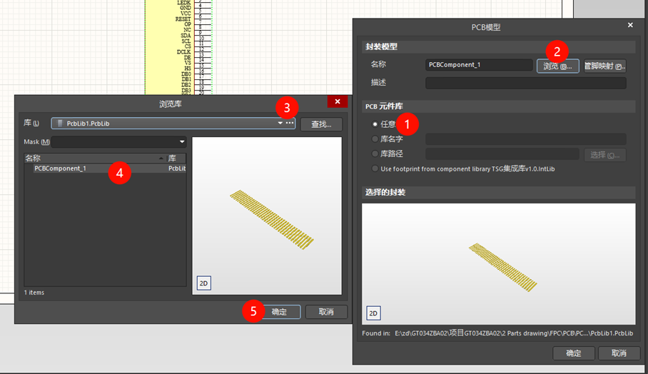 封装模型中点击浏览,选择刚刚新建的Pcblib1,选择对应的封装,确定。