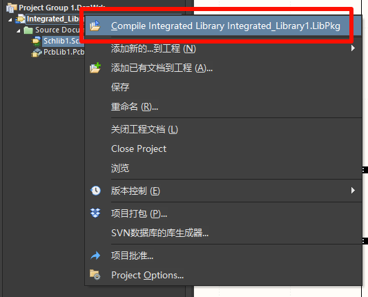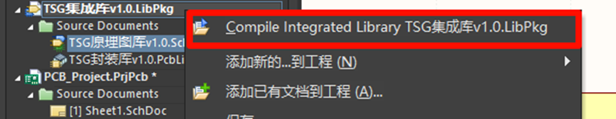 鼠标右键TSG集成库v1.0.LibPkg,左键单击Compile Integrated Library TSG集成库v1.0.LibPkg打包两个库文件。