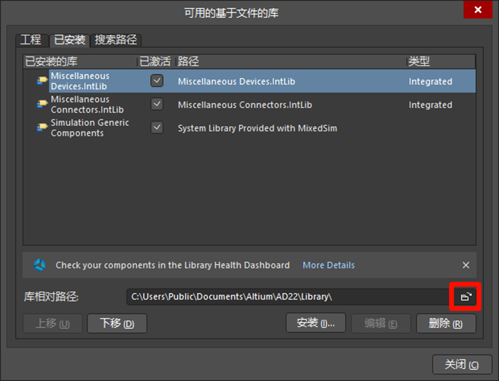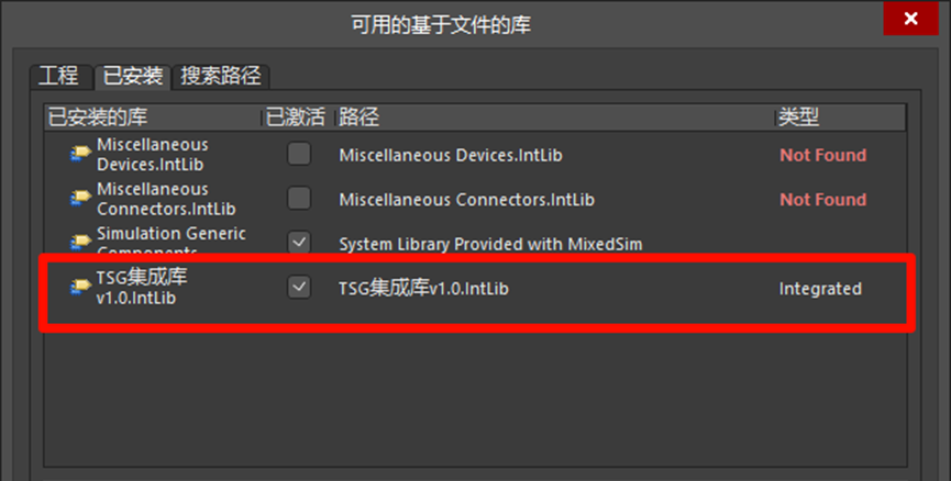 库相对路径处,选择文件夹1:Project Outputs for TSG集成库v1.0所在路径,单击选择文件夹。再点击安装,选择文件:TSG集成库v1.0.IntLib。