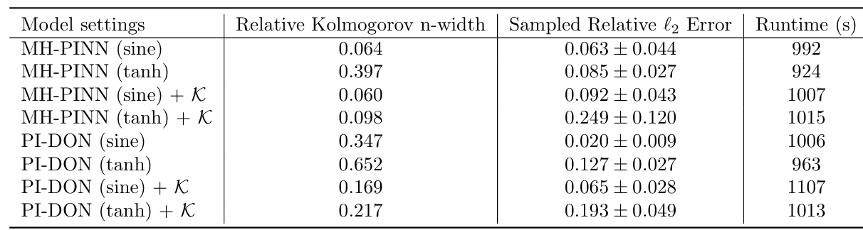 方法:论文针对多任务PIML缺客观指标的问题,以Kolmogorov n 宽度为核心方法:先训练 MH-PINNs、PI-DONs 等 PIML 模型得到基函数,再通过双优化算该宽度,还将其作为正则项融入三优化训练,缓解过拟合、提升泛化性,最终在 1D 泊松方程等任务上验证其能有效对比 PIML 架构性能,避免采样误差误导。