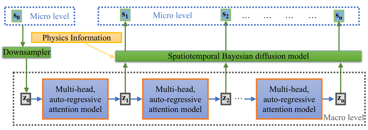 方法:论文提出 G-LED 框架,以物理信息机器学习为核心:将高维数据下采样到低维流形,用多头自回归注意力模型演化其动力学,再通过融入物理信息的贝叶斯扩散模型将低维流形映射回高维空间,实现高维复杂系统模拟加速与准确预测。