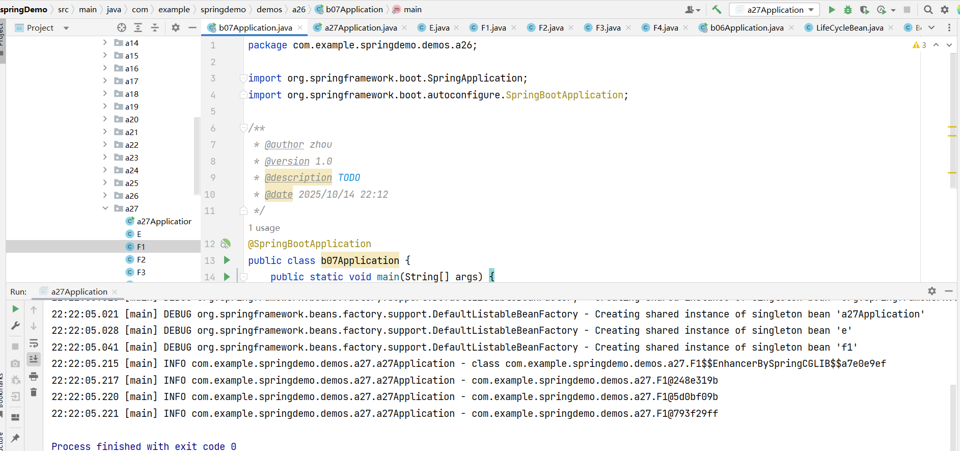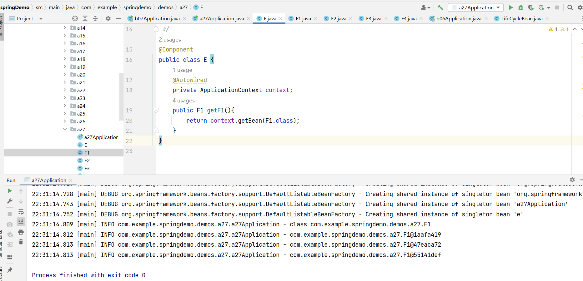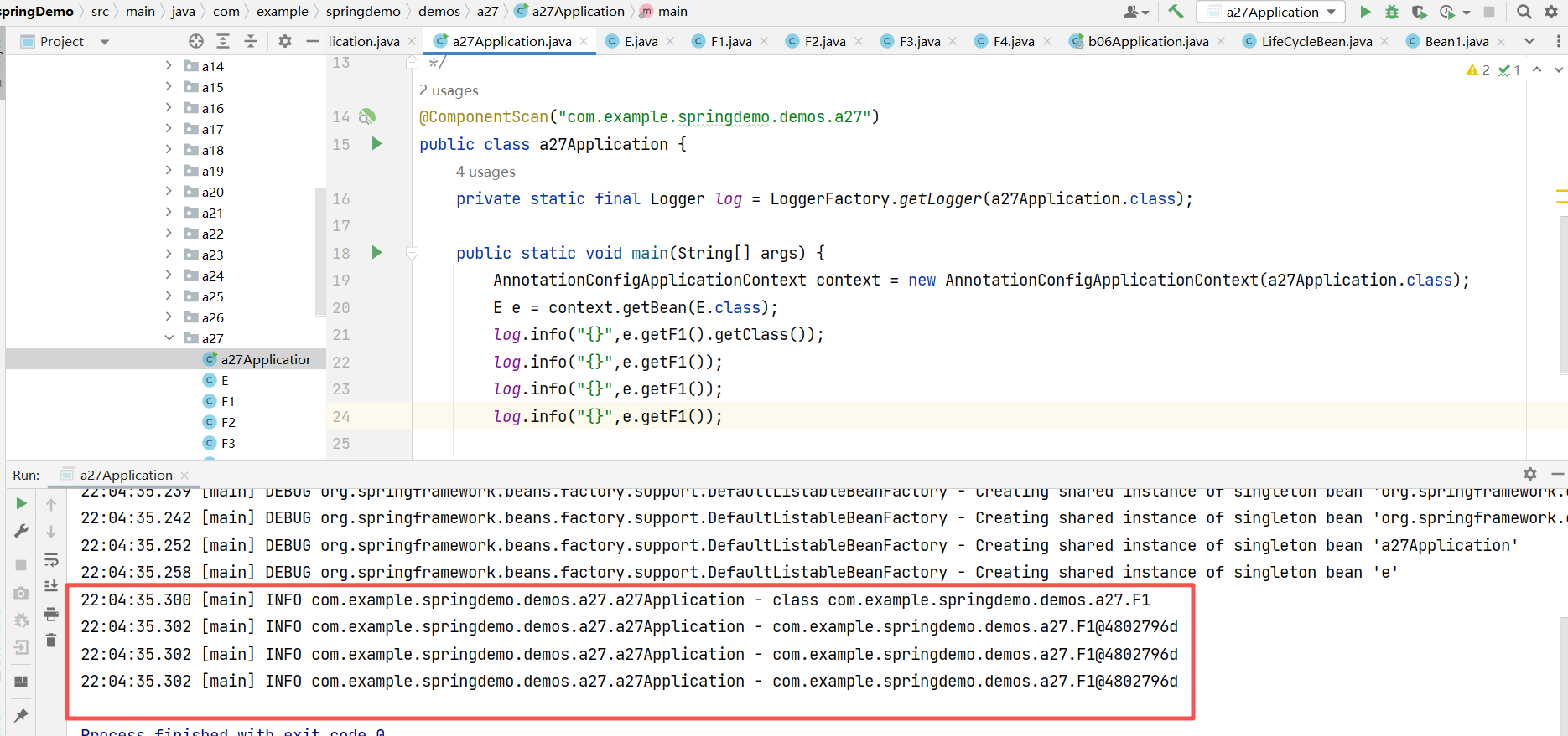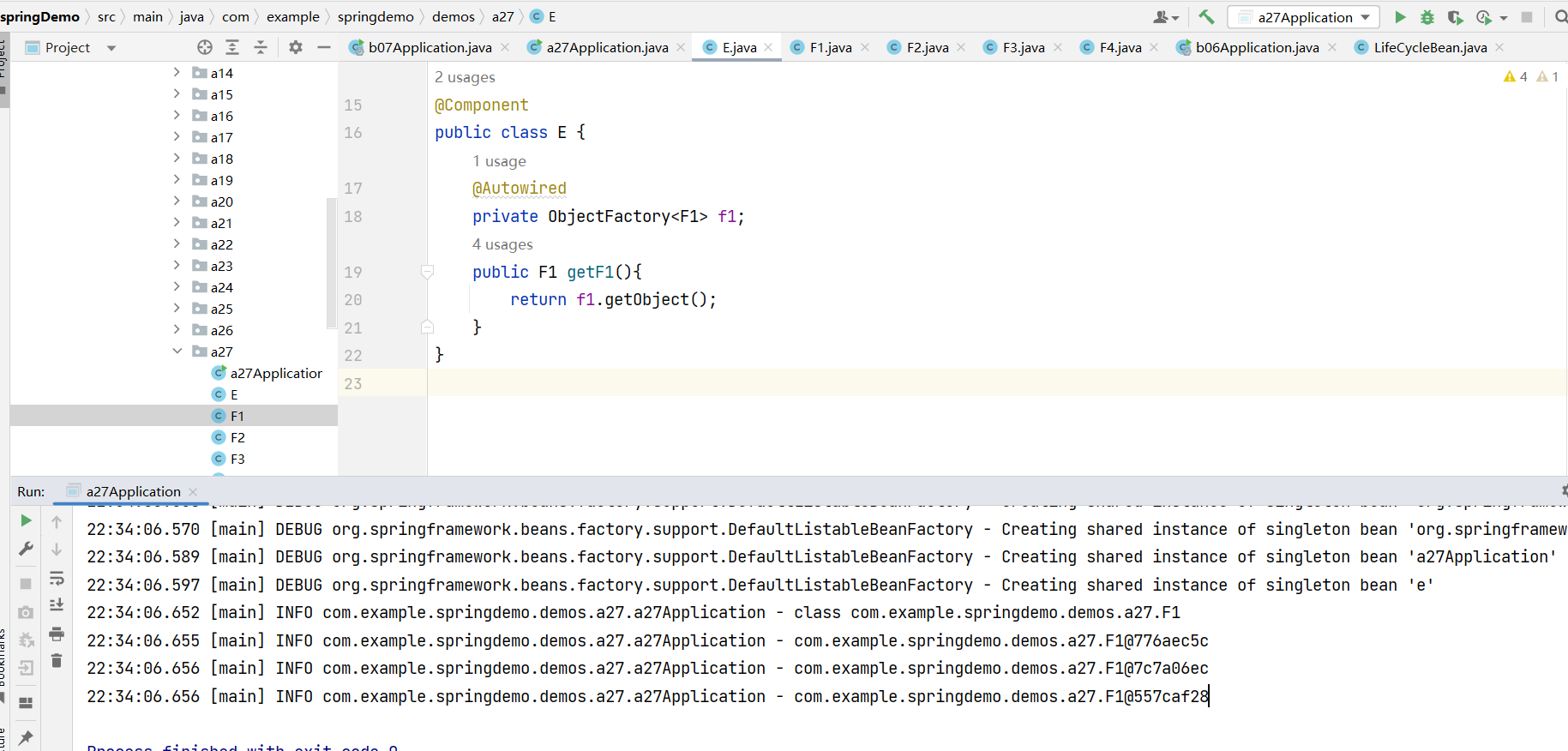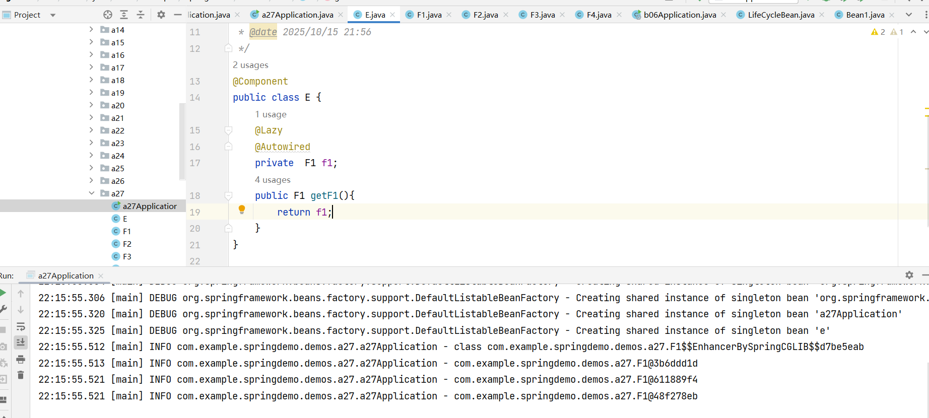 public class a27Application {private static final Logger log = LoggerFactory.getLogger(a27Application.class);public static void main(String[] args) {AnnotationConfigApplicationContext context = new AnnotationConfigApplicationContext(a27Application.class);E e = context.getBean(E.class);log.info("{}",e.getF1().getClass());log.info("{}",e.getF1());log.info("{}",e.getF1());log.info("{}",e.getF1());}