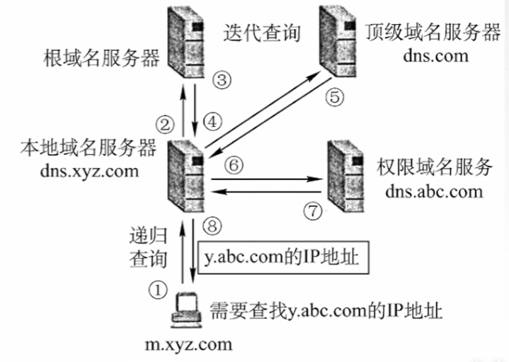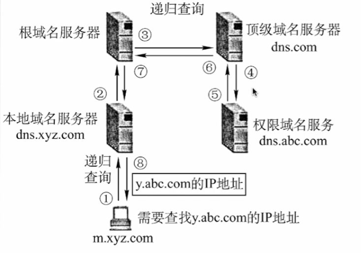 首先查询本地域名服务器有没有目标IP地址,如果没有,则以本地域名服务器为客户端向根域名服务器发送请求。如果根域名服务器没有,则以根域名服务器为客户端向顶级域名服务器发送请求。如此递归下去知道权限域名服务器获得到IP地址,然后再顺着递归的路径返回。