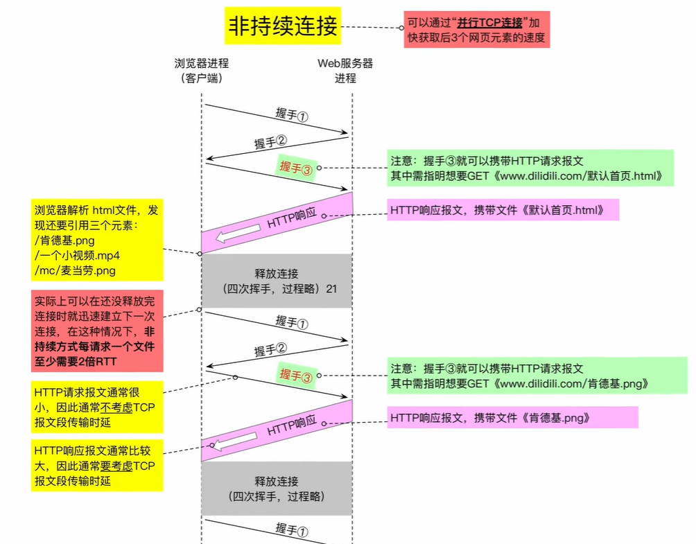 - 如果 html 引用了其他 n 个元素,还需 n 组 HTTP 请求 & 响应(持续、非持续工作方式有所区别)
