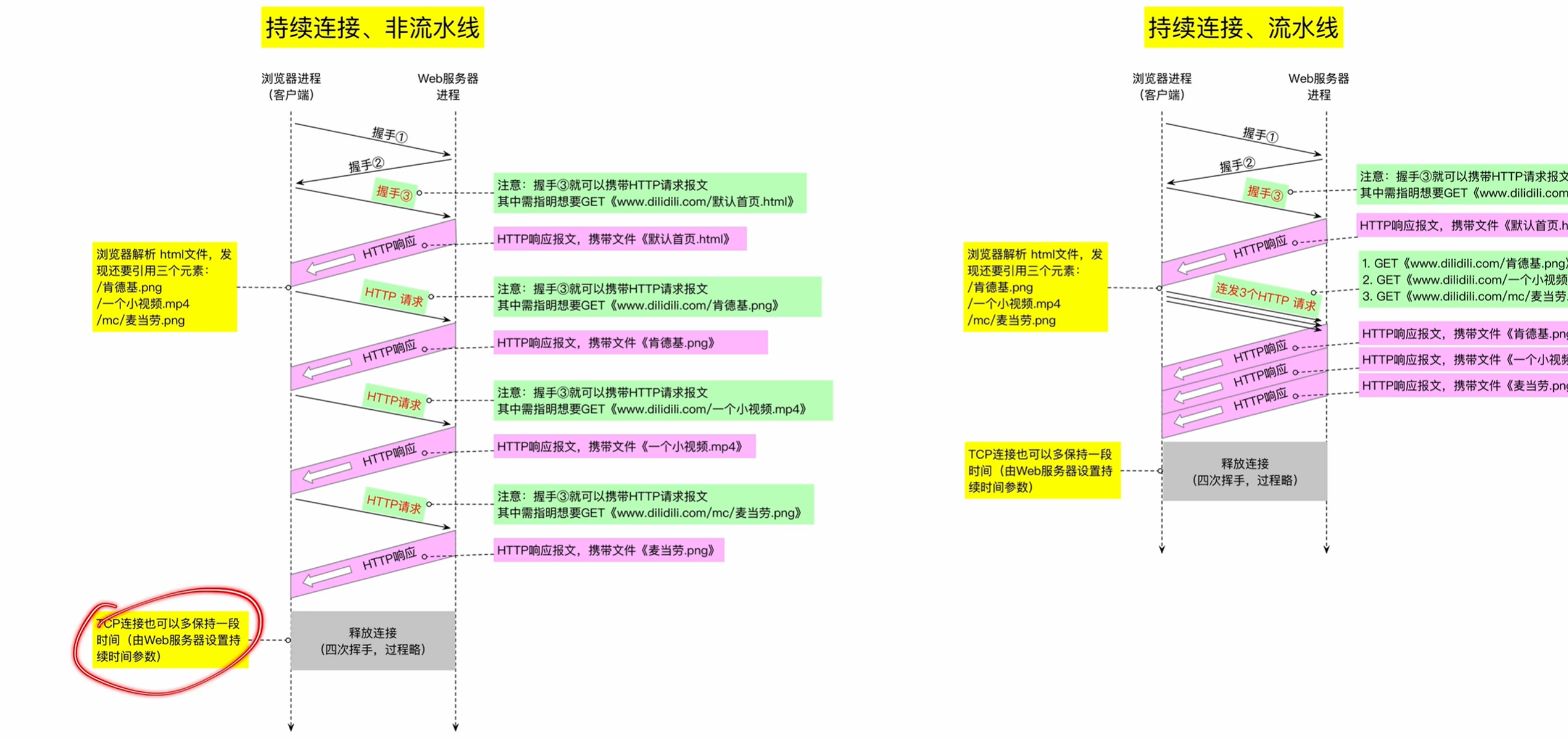 建立TCP连接后会一直持续,直到依次获取到所有的HTTP响应报文,然后再根据设置的时间参数断开连接。首先解析html文件,了解还需要获取多少元素,然后一次性发出所有的HTTP请求。