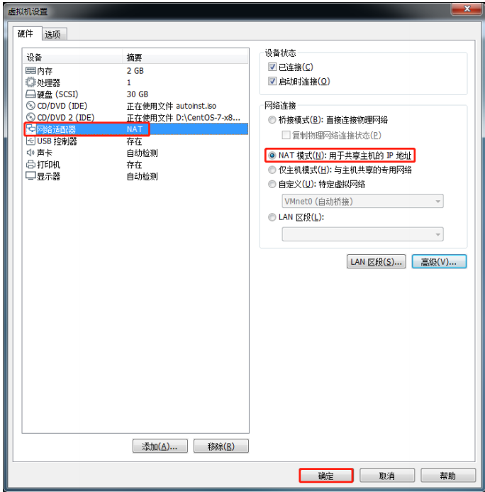 设置网络连接模式为NAT模式,如下图: