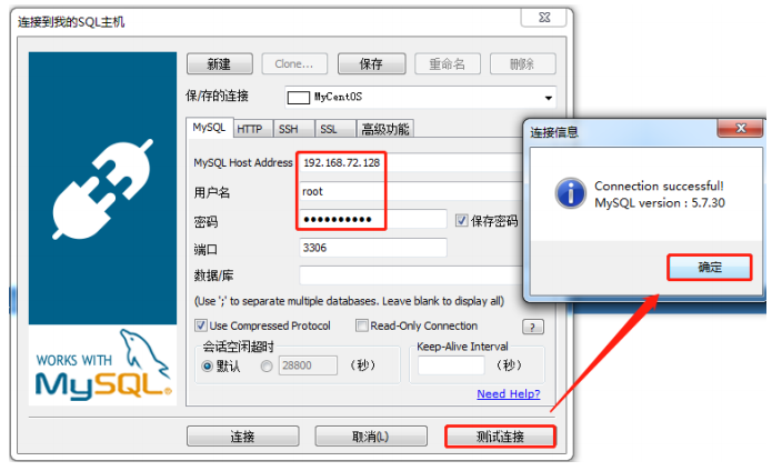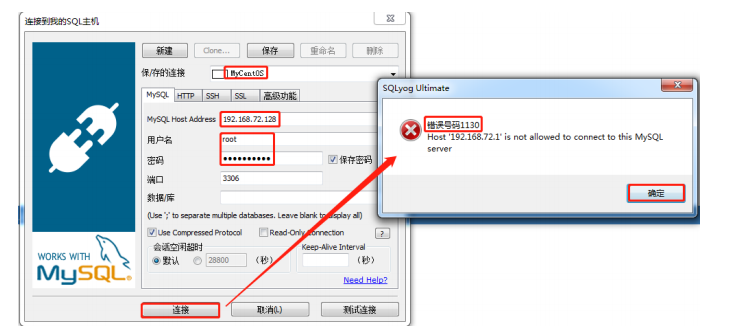 启动图形化界面工具SQLyog连接虚拟机中Mysql数据库,如下图: