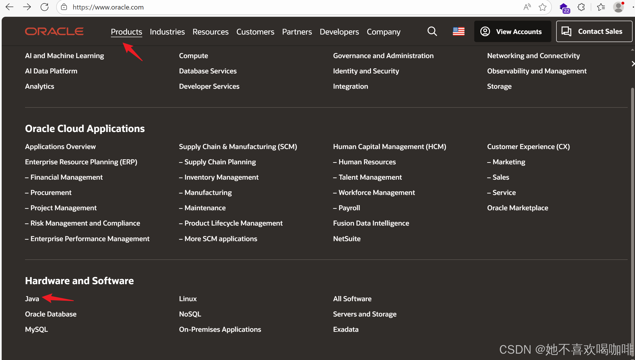 1 访问 Oracle 官网 ,https://www.oracle.com/ 点击 Products ,选择 java 。