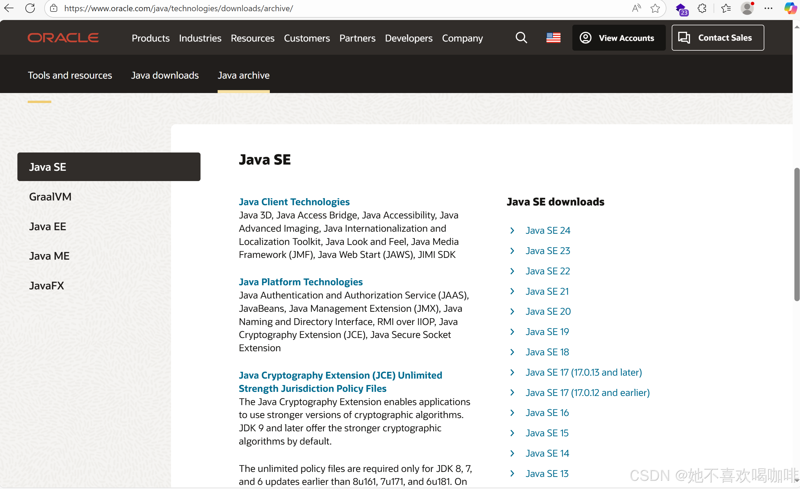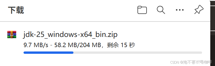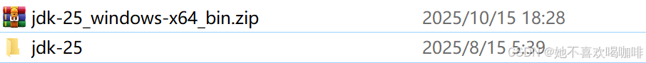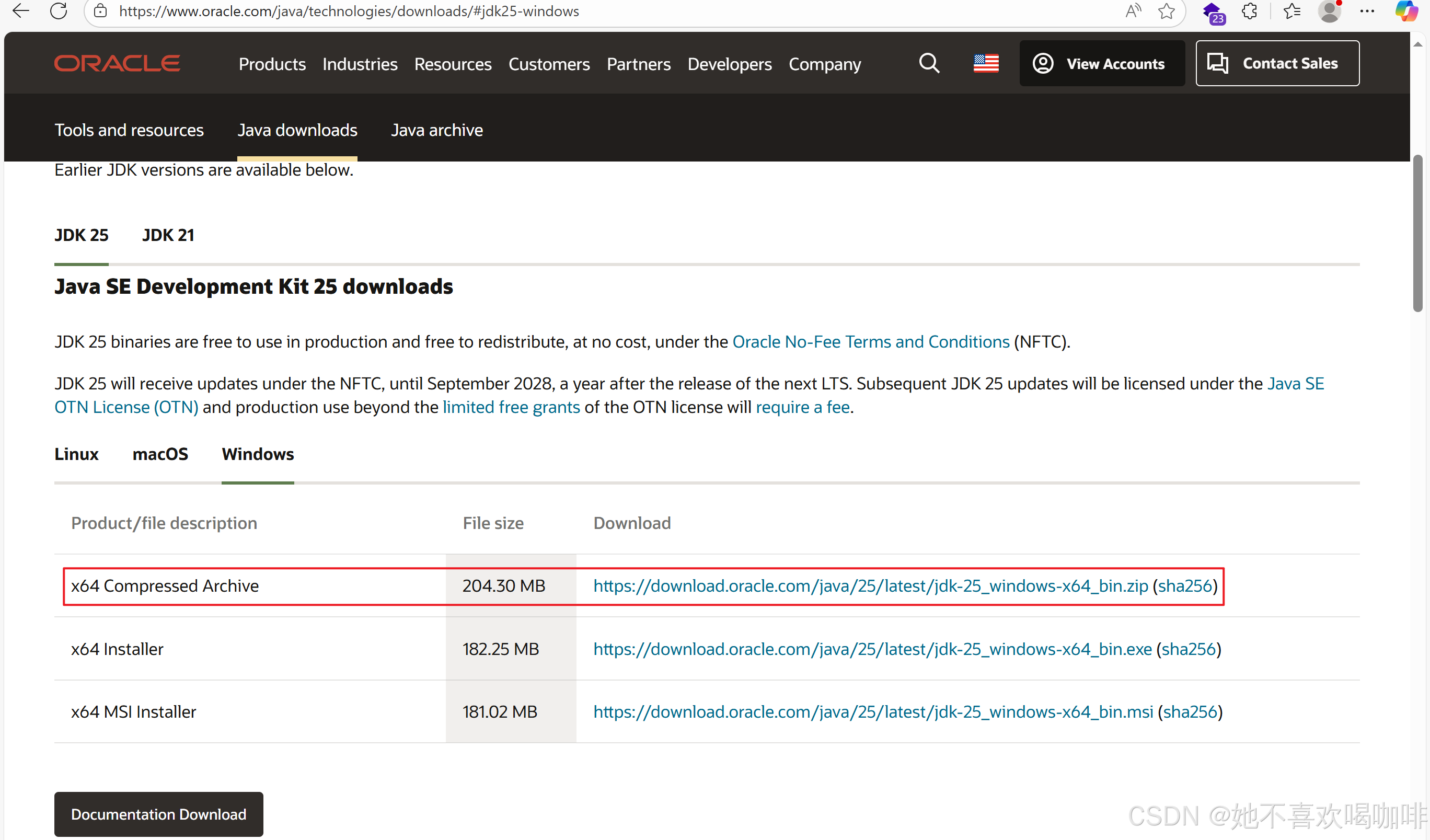 3 跳转后,选择合适的版本进行下载,此处下载的 JDK 25 这个是压缩版,也可以下载 安装版 Installer,点击 Java archive 可以看到历史版本。