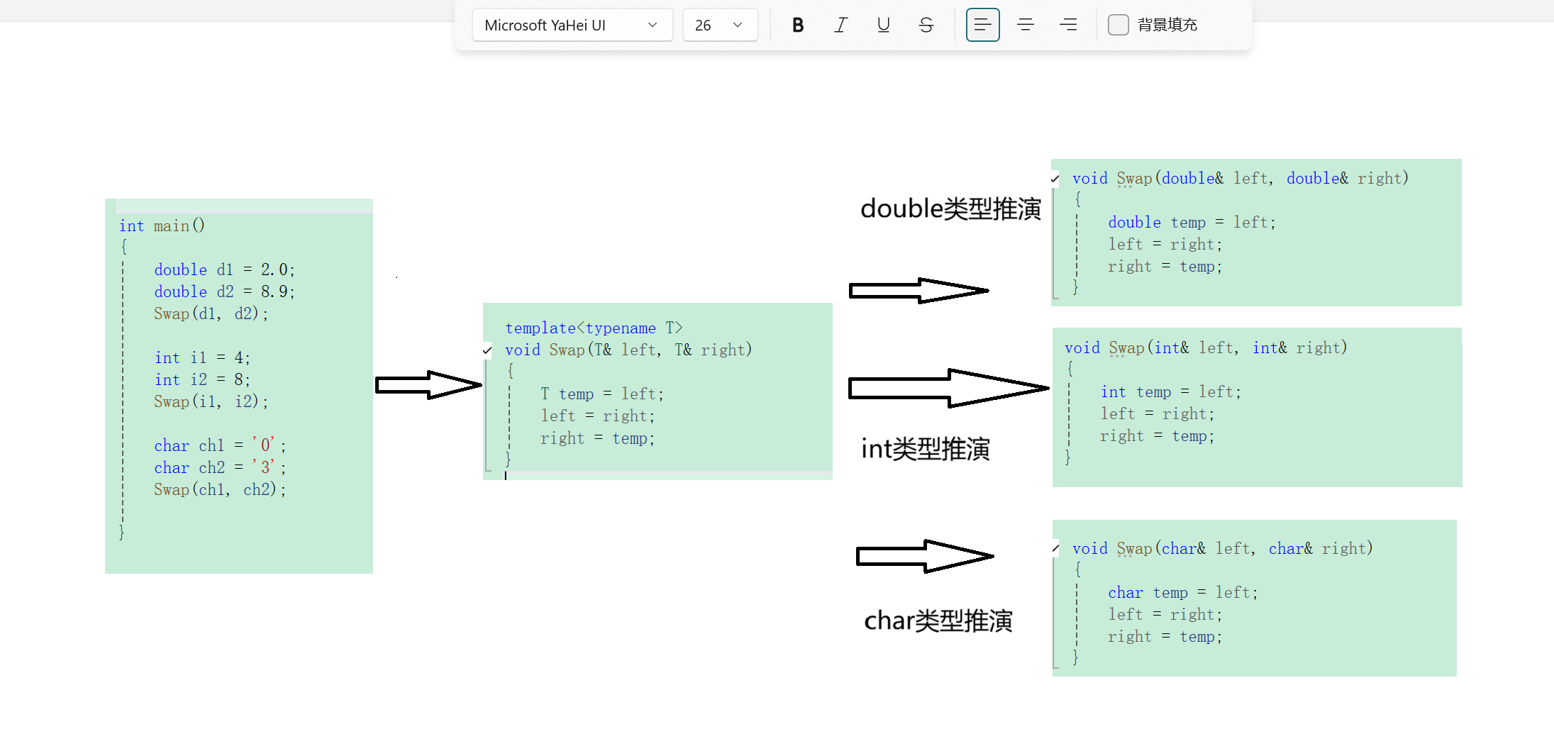 在编译器编译阶段,在使用函数模板时,编译器根据传入的实参类型来推演生成对应类型的函数以供调用。比如:用double类型使用函数模板时,编译器通过对实参的推演,将T确定为double类型,然后产生一份专门处理double类型的代码,对于字符类型也是如此。