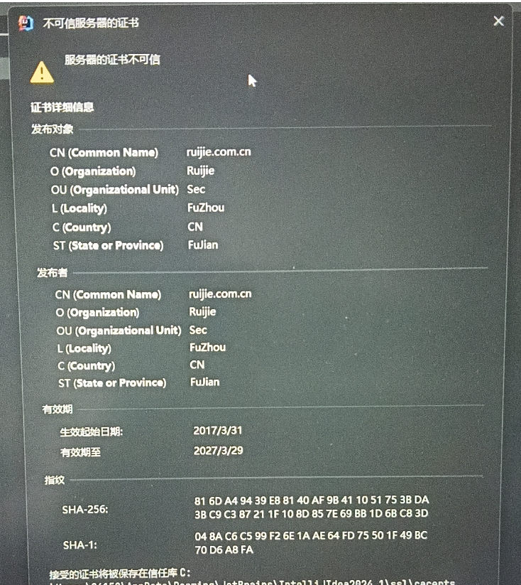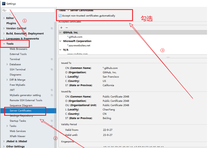 当前位置: 首页 > news >正文 IDEA弹框 Server‘s certificate is not trusted /服务器的证书不可信如何解决 news 2025/10/16 6:47:01 1、出现如下弹框2、idea左上角点击File—>settings---->Tools------>Server Certificates,将最上方勾选上,如下图。 查看全文 http://www.dtcms.com/a/486235.html 相关文章: rxn_yields 仓库介绍(https://rxn4chemistry.github.io/rxn_yields/) 前端视频课程添加水印,全屏不消失解决方法 湖州网站建设哪家好google云平台 wordpress Spring Boot性能优化详解 leetcode 329 矩阵中的最长递增路径 生成模型实战 | 实时任意风格迁移 C++ --- 模版初阶 外贸家具网站.net网站开发简介 Django 的文档接口 blender中对合并的物体重复设置材质,删除重复材质,批量复制材质 IDEA界面突然出现一条“竖线”,附解决办法 Git 学习及使用 使用OpenGL加速图像处理 CUDA 调试器 sanitizer,检测数据竞争,竞争条件 race condition Blender布料物理模拟生成插件 Simply Cloth Studio V1.4.4 + Simply Cloth Pro v3.0附使用教程 AWS CloudWatch:服务器的“眼睛”,实时监控一切动向 云南省建设厅合同网站嵊州门户网站 做网站需要学jsp我也来做外国网站购物 异步数据采集实践:用 Python/Node.js 构建高并发淘宝商品 API 调用引擎 Spring Boot 3零基础教程,yml文件中配置和类的属性绑定,笔记15 Lua C API 中一段LUA建表过程解释 用于大语言模型后训练阶段的新方法GVPO(Group Variance Policy Optimization) k8s集群环境下Jenkins环境性能测试项目实战 【k8s】在 k8s上部署一个 web 服务 怎做网站网页设计属于什么行业 02 Oracle JDK 下载及配置(解压缩版) 「10.11」闪崩前比特币做空风波 目标检测学习总结 java求职学习day40 服装公司网站首页做头像的网站空白