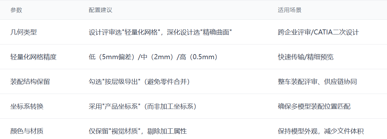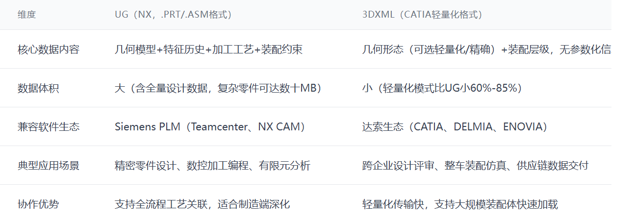 - 跨生态协作刚需:主机厂多采用CATIA+3DXML作为协作标准,零部件供应商使用UG设计的模型需转为3DXML才能接入主机厂的PLM系统
