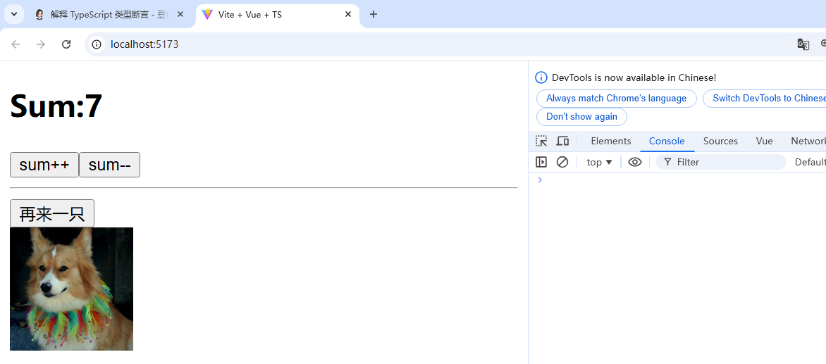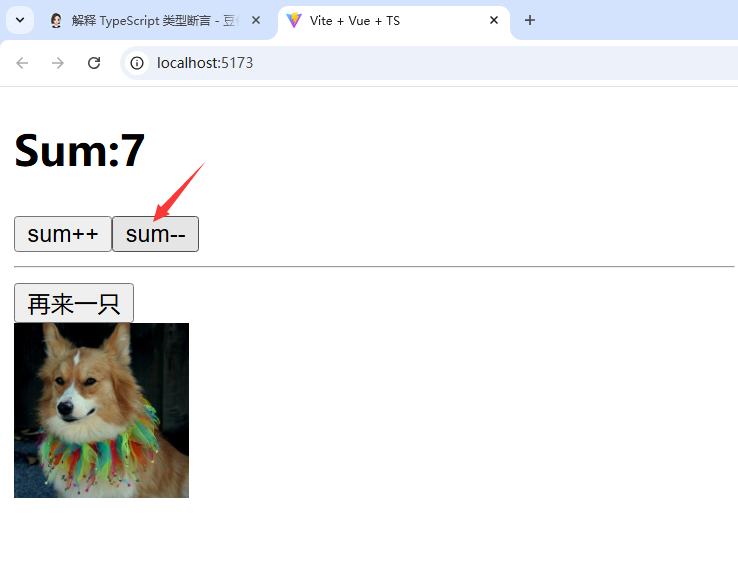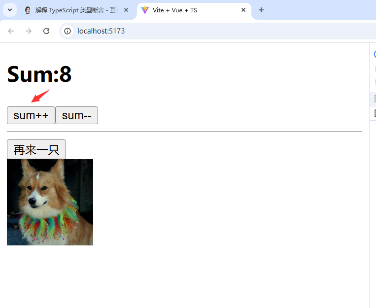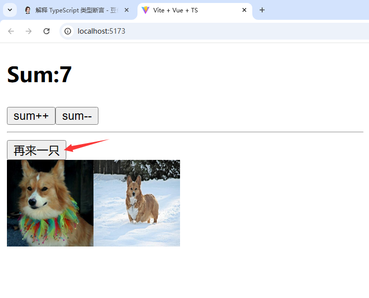 <template><h2>Sum:{{sum}}</h2><button @click="increment">sum++</button><button @click="decrement">sum--</button><hr/><button @click="getDog">再来一只</button><br/><img style="width: 100px;height: 100px;" v-for="(dog,index) in dogList" :key="index" :src="dog.message"></template><script lang="ts" setup name="myTest">import UserSum from "./ts/UserSum";import useDog from "./ts/useDog";let{sum,increment,decrement}=UserSum();let{dogList,getDog}=useDog();