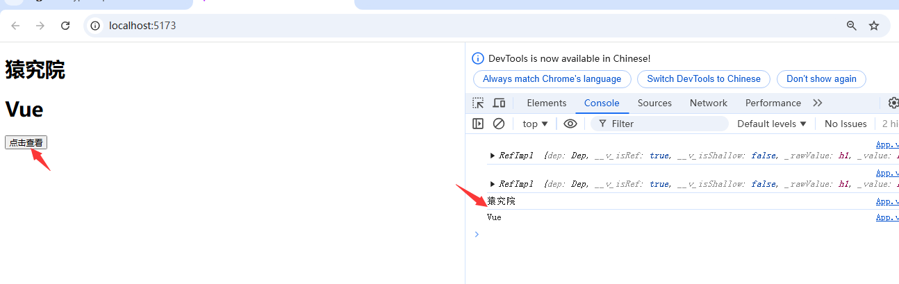 上述案例中,我们创建了两个普通标题标签,并在标签中添加ref属性,然后再脚本部分通过ref函数获取到这两个标签对象,注意标签对象的名称要与标签中ref属性的值一致;之后再单击鼠标时间的回调函数中输出了这两个标签对象及标签对象的内容文本内容;
