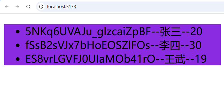 <template><div class="person"><ul><li v-for="p in list":key="p.id">{{p.id}}--{{p.name}}--{{p.age}}</li></ul></div>