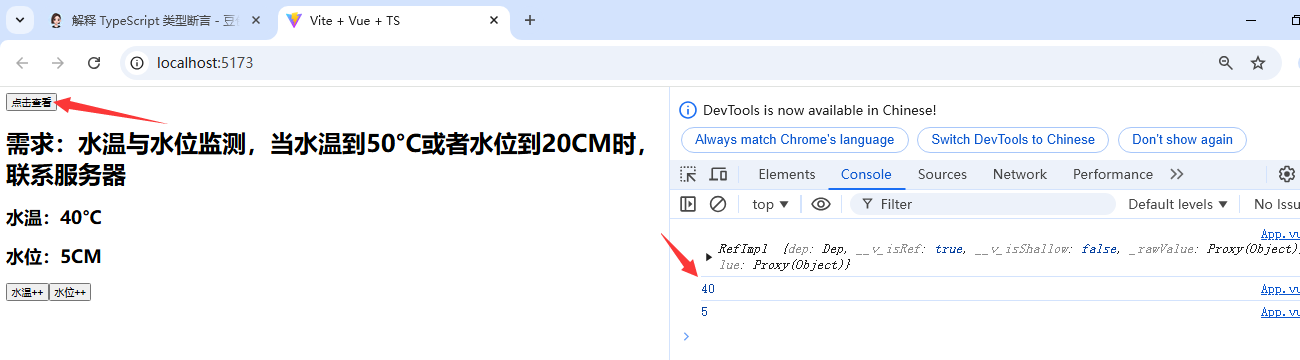 <template><h1>需求:水温与水位监测,当水温到50°C或者水位到20CM时,联系服务器</h1><h2>水温:{{ temp }}°C</h2><h2>水位:{{ height }}CM</h2><button @click="changeTemp">水温++</button><button @click="changeHeight">水位++</button>