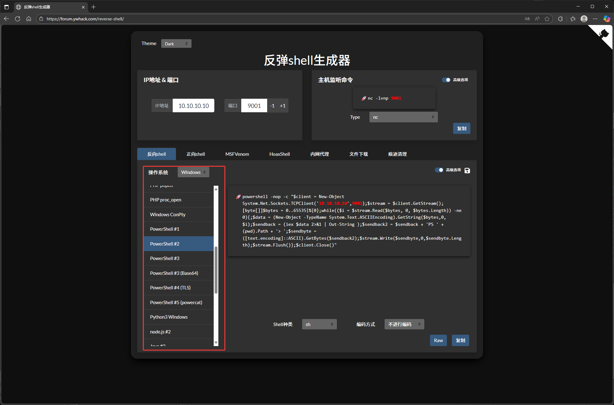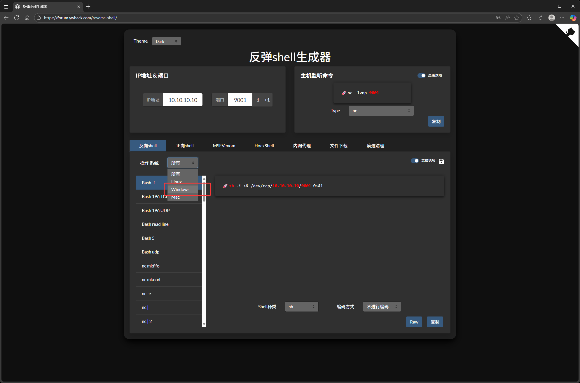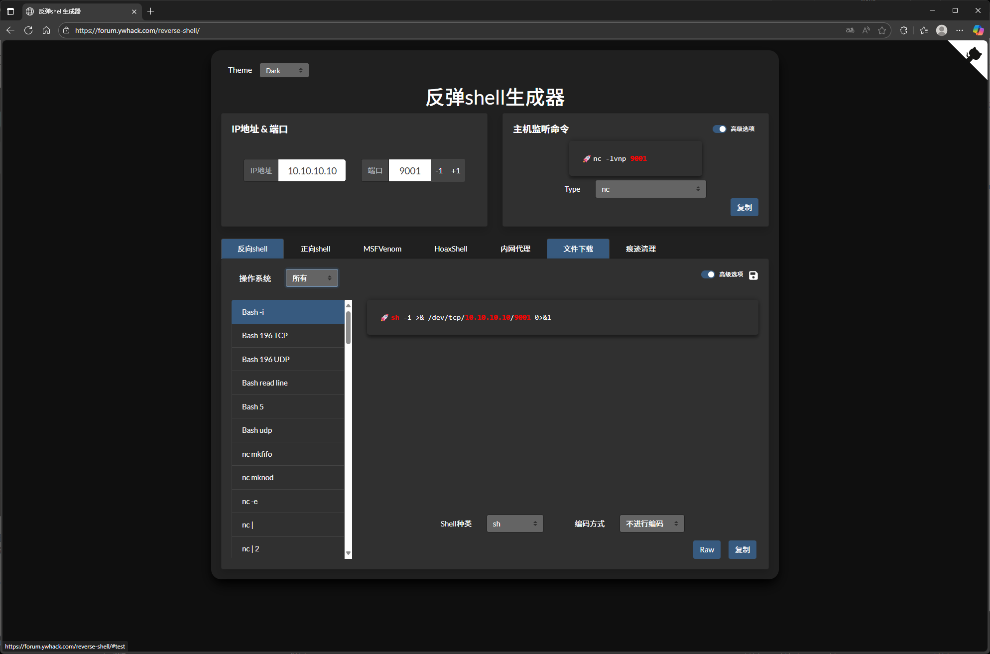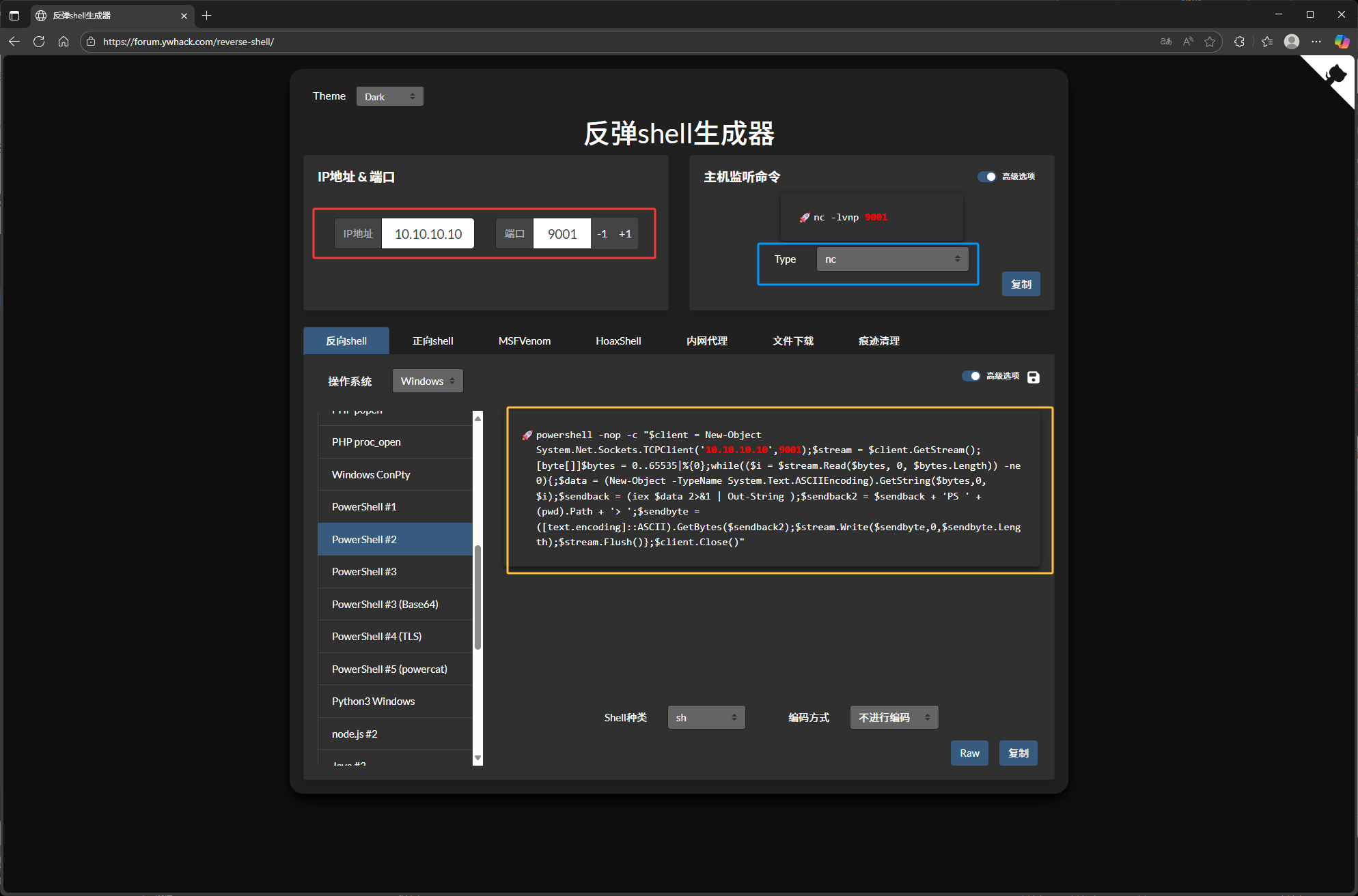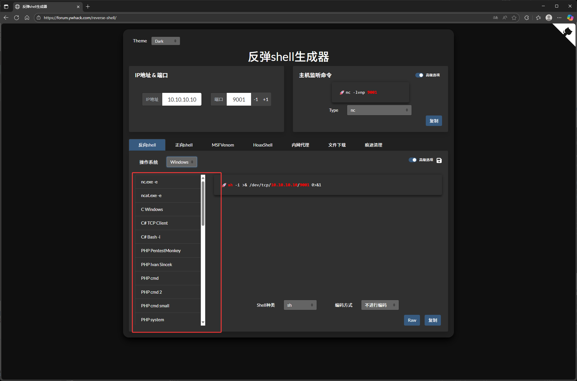 只需在下图红框输入攻击者的ip和端口,然后在下图蓝框选择攻击者使用的工具,然后复制下图黄框的内容,这是反弹Shell的方式,所以攻击者启动监听,然后在受害者电脑上执行从下图红框中复制出来的命令,就可以了,注意它复制后可能是没办法运行的,后面还会有其它办法反弹Shell,优先使用开发环境的方式反弹Shell,比如c、Python、Java
