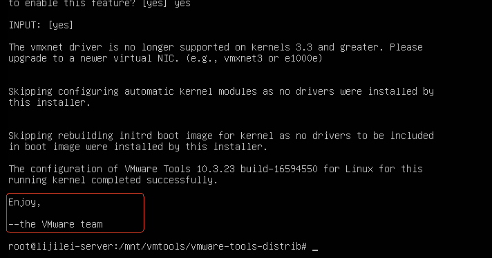 注意,在安装vmtools时,所有选项,给出输入 [yes] 或者 输入[No]的地方全部输入yes, 不要求输入的时候就回车使用默认设置