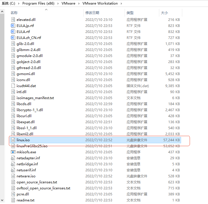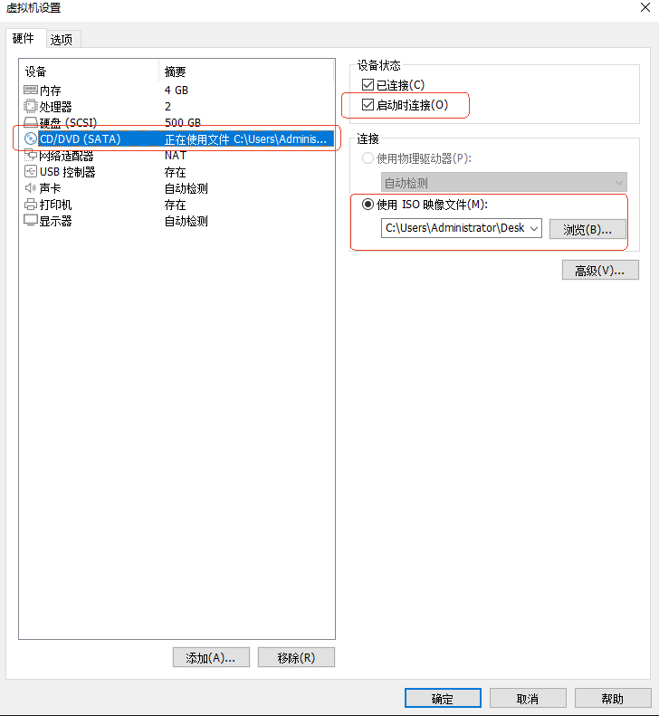 勾选启动时连接,ISO镜像可在VMware安装目录找到