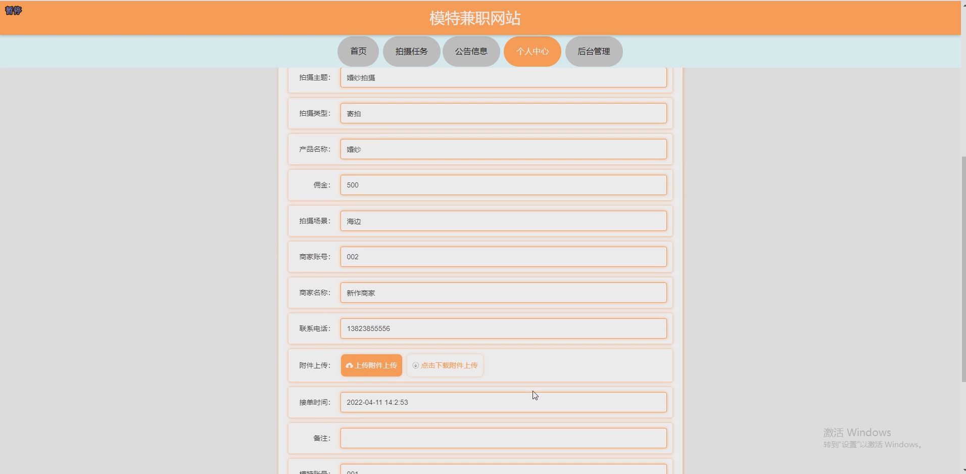 - 模特登录系统后,进入个人中心页面,完善个人资料,包括个人简介、身高、体重、三围(针对服装模特)、擅长拍摄类型(如平面拍摄、视频拍摄、古装拍摄等)、工作经验、获奖情况、联系方式(可设置是否公开)、上传个人照片和作品集(支持批量上传、预览、删除、排序等操作)。个人资料完善后,系统将资料展示在模特的个人主页上,供商家查看。