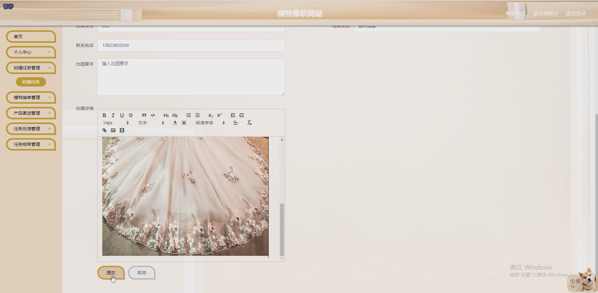 - 商家进入任务发布页面,填写任务名称、任务类型(如服装拍摄、产品展示拍摄等)、任务要求(如模特身高、体重、风格等)、任务报酬、任务周期、拍摄地点(线上或线下)、产品相关信息(如产品名称、数量、规格等)等内容,上传任务相关参考图片(如产品图片、期望拍摄效果图片等),确认信息无误后提交任务,系统将任务信息保存到数据库,并在任务列表中展示。