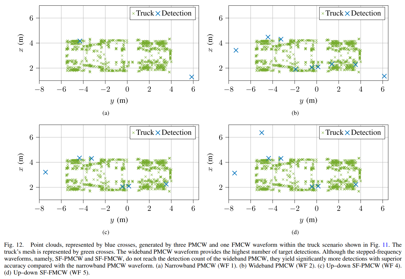 - 图©的WF4和图(d)的SF-FMCW(WF5)表现相当出色,虽然点云密度略逊于WF2,但同样生成了足够多的有效检测点来识别卡车的存在和大致轮廓,性能远超WF1。这表明在实际的、复杂的探测任务中,SF-PMCW方案同样具有很强的竞争力。
