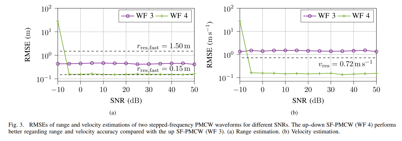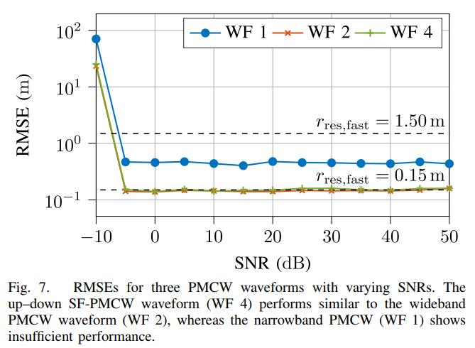 图7 则将WF4与传统方案进行了对比。WF4(星形标记线)的距离估计RMSE曲线与拥有10倍瞬时带宽的WF2(三角形标记线)几乎完全重合,两者都达到了由1000MHz带宽决定的0.15米理论分辨率极限。而与WF4拥有相同瞬时带宽的WF1(圆形标记线),其误差则始终停留在由100MHz带宽决定的1.5米分辨率水平。这一结果证明,SF-PMCW方案用100MHz的硬件成本,实现了1000MHz的系统性能。
