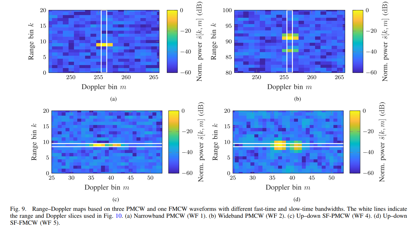 - 图©展示了WF4。虽然它的快时间分辨率和WF1一样差,但在距离上无法区分目标。然而,由于两个目标处于不同的距离,它们在经过Up-Down处理后,被映射到了不同的(伪)多普勒单元(Doppler bin 41和37)。换言之,WF4利用了(可控的)距离-多普勒耦合效应,将距离上的分离问题转化为了多普勒域上的分离问题,从而成功识别出两个目标。