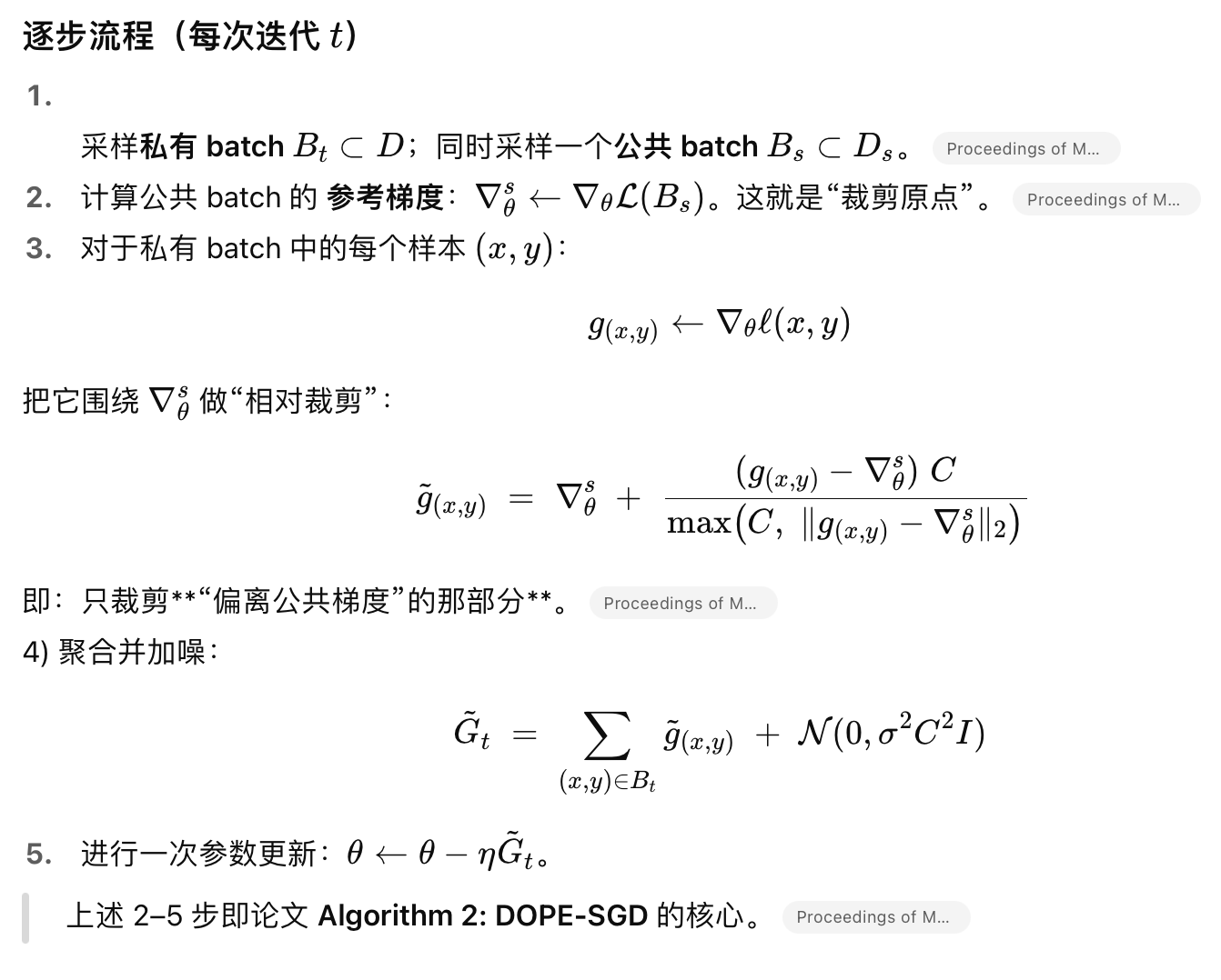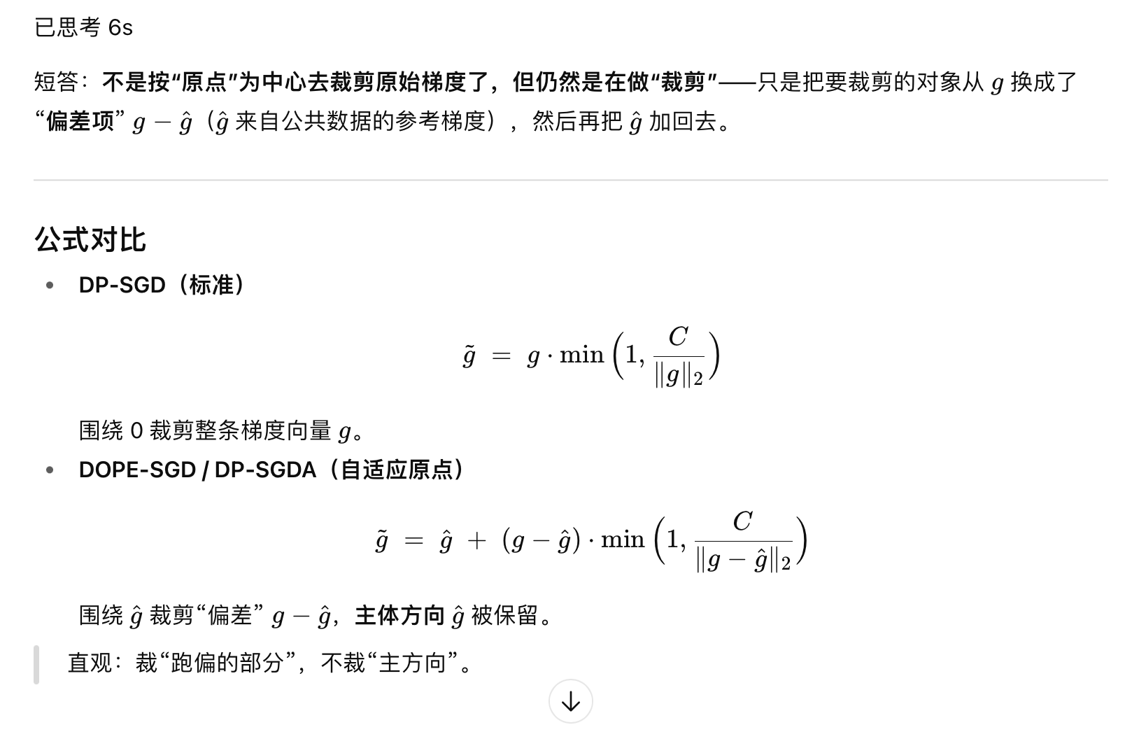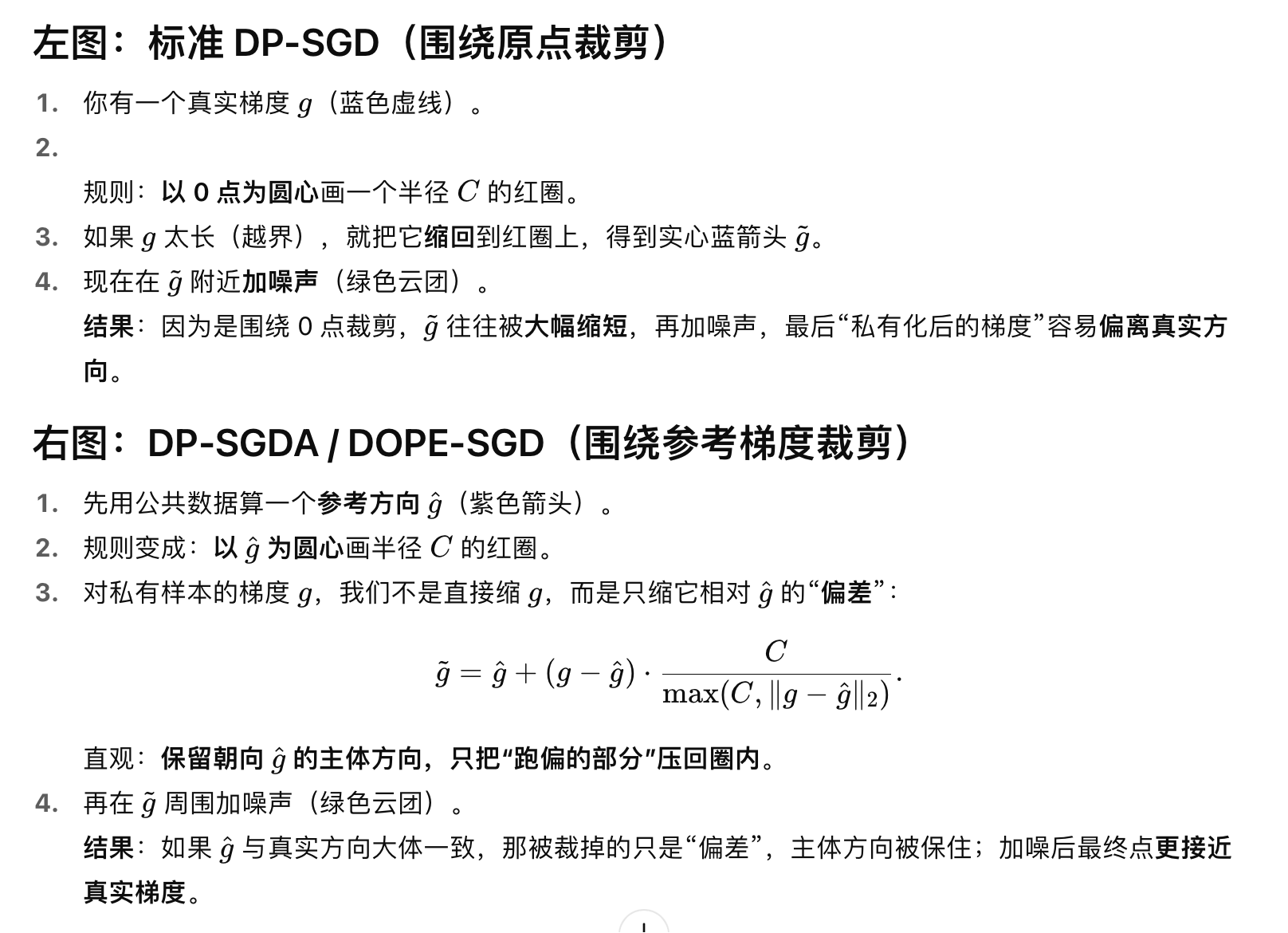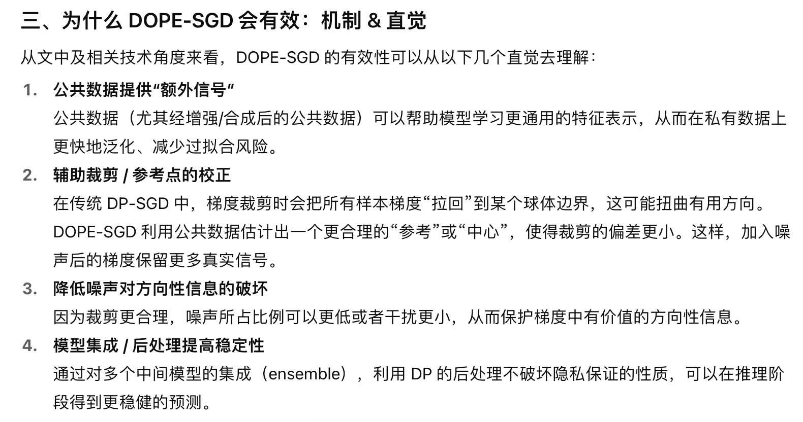 DOPE-SGD 探索使用公共数据 / 合成数据去重新确定梯度的“起点”(origin),即通过公共数据推断一个参考点或修正梯度方向,从而在裁剪与加噪过程中减少信息损失、降低噪声方差