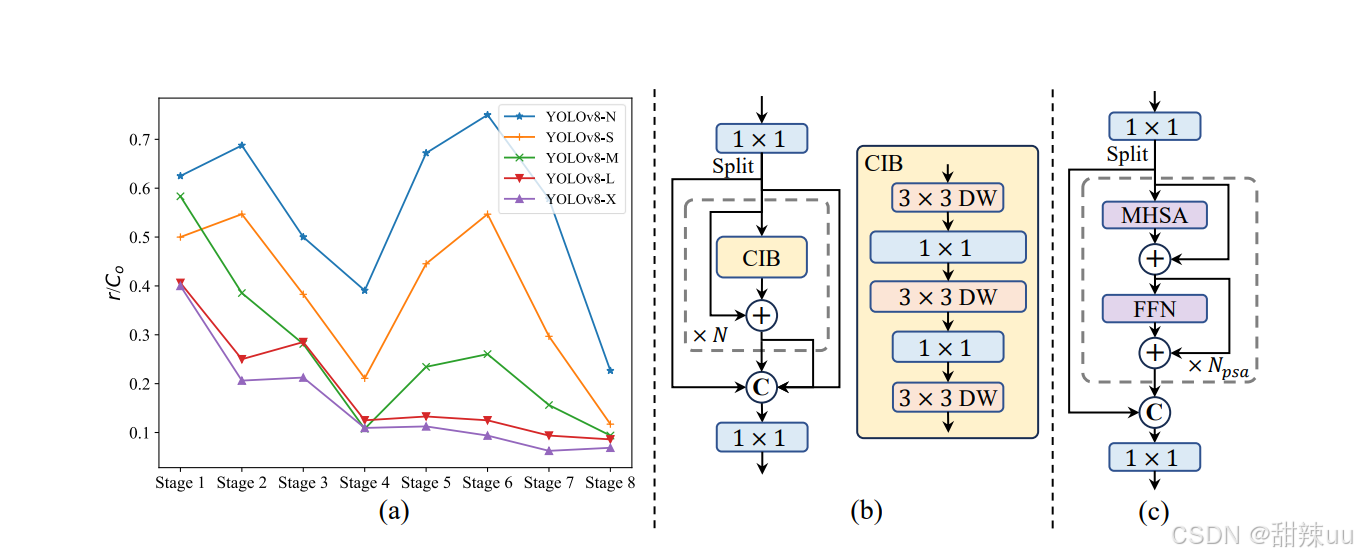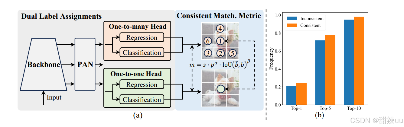 NMS-free(端到端)训练:一致的双分配(consistent dual assignments) —— 通过设计训练时的双分配策略,能在不依赖 NMS(non-maximum suppression)后处理的情况下获得稳定的检测输出,从而降低推理延迟并使模型更“端到端”。arXiv