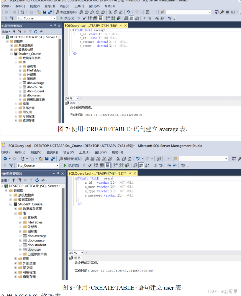 通过本次实验,我学会了在SQL Server中设计表结构,掌握了表的构成要素、列级约束和表级约束,并能通过MSSMS对象资源管理器创建复杂的表结构,如student、course、average和user表。同时,我也能够熟练运用CREATE TABLE语句在查询窗口中创建这些表。