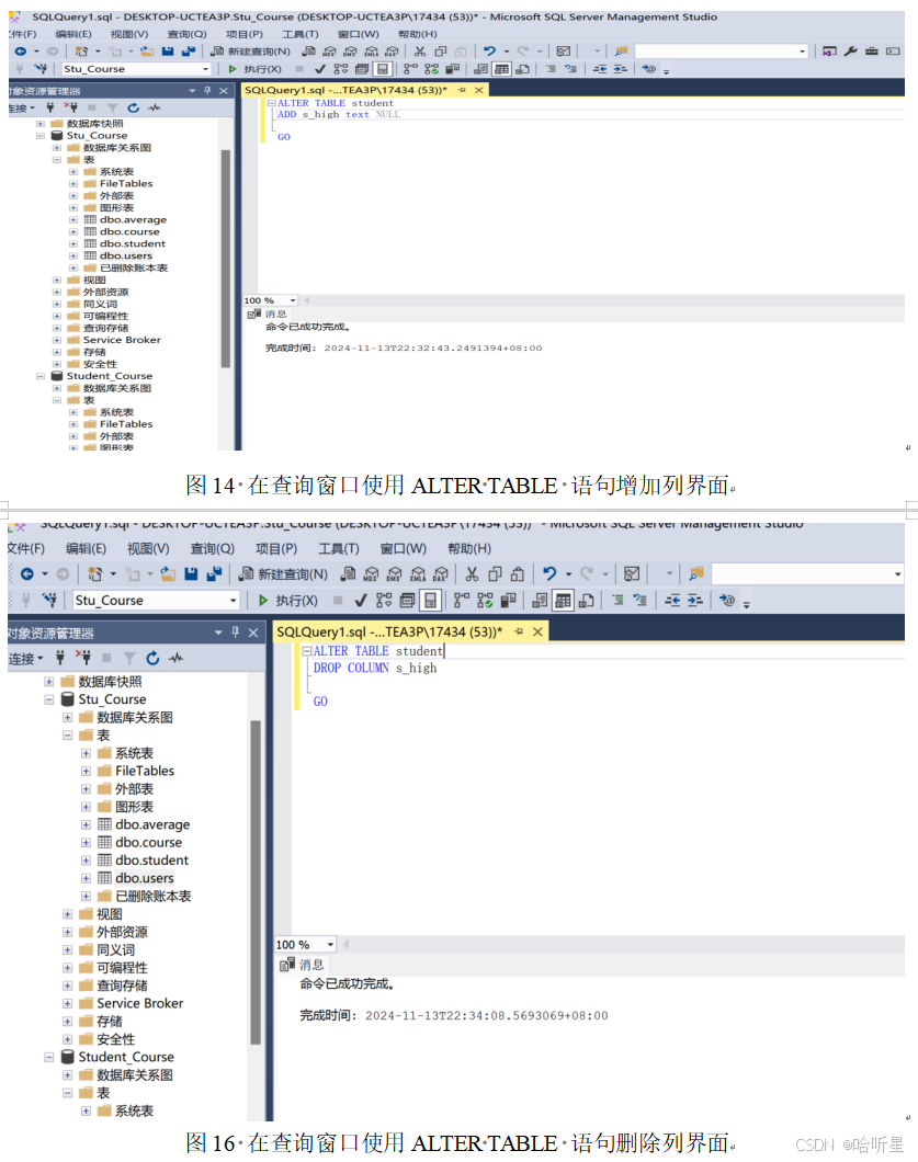 4.在查询窗口使用ALTER TABLE语句修改表的结构(实验指导书第70页-第72页)。