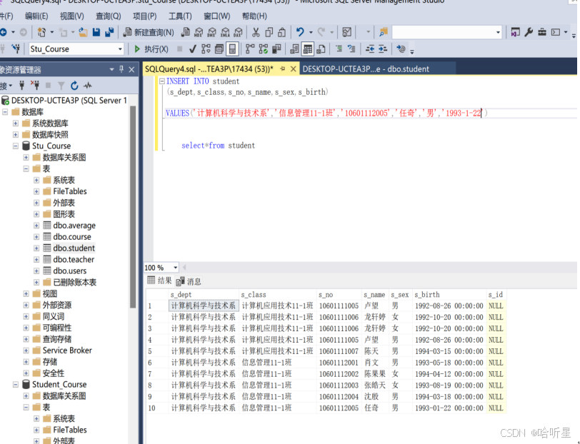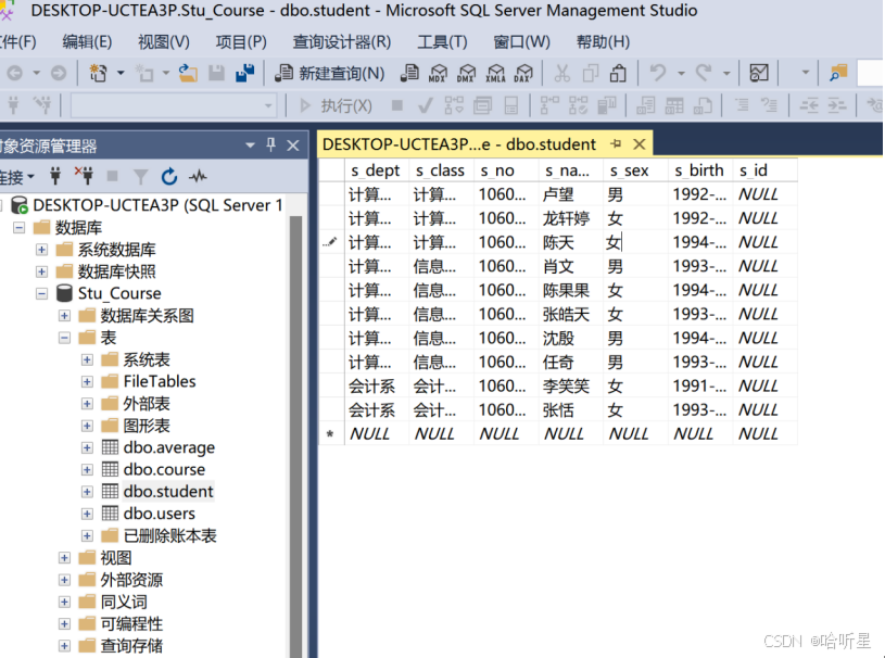 7.使用MSSMS企业管理器练习向student表中录入数据