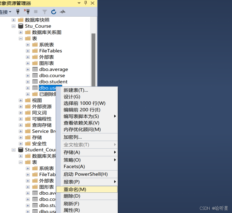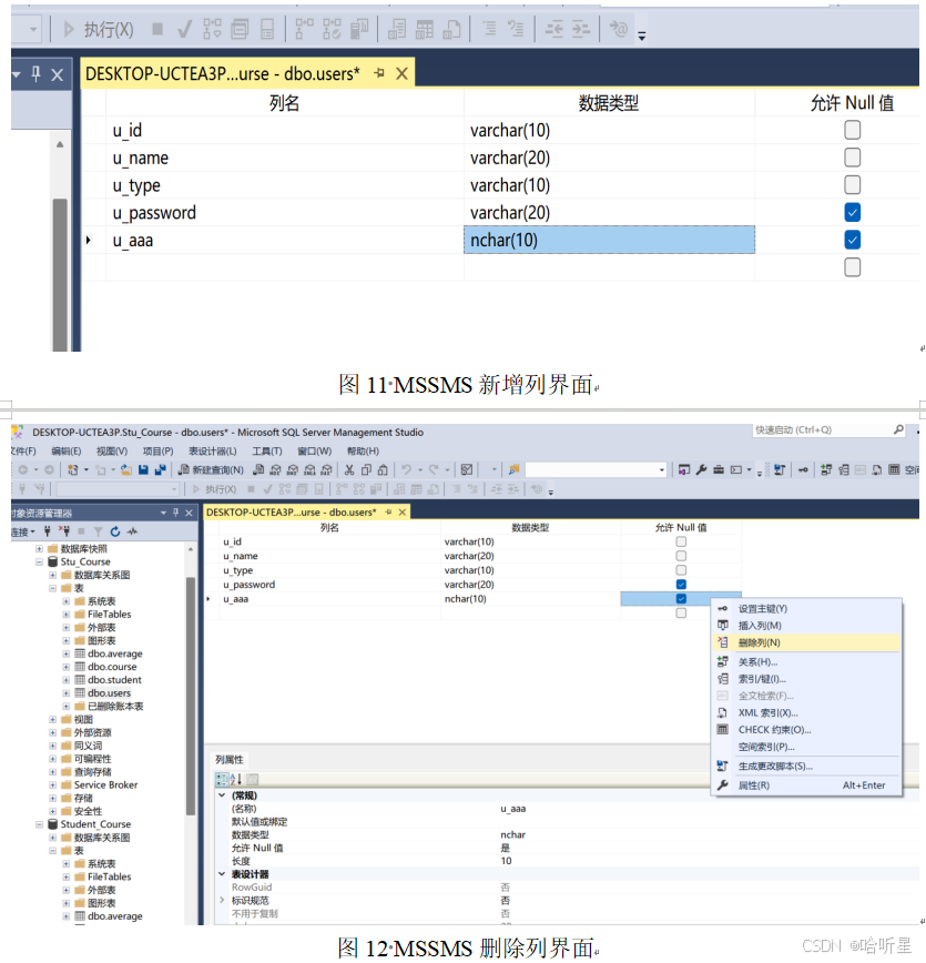 (3)学会使用企业管理器(即MSSMS-----Microsoft SQL Server Management Studio的对象资源管理器的菜单-会话窗方式)创建表、修改表、删除表、向表中插入数据、修改表数据、删除表数据。