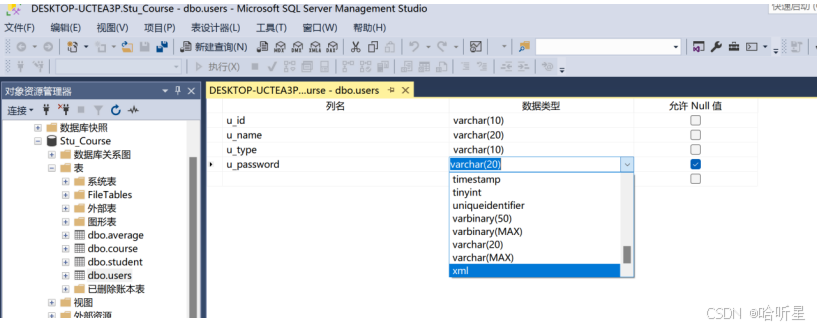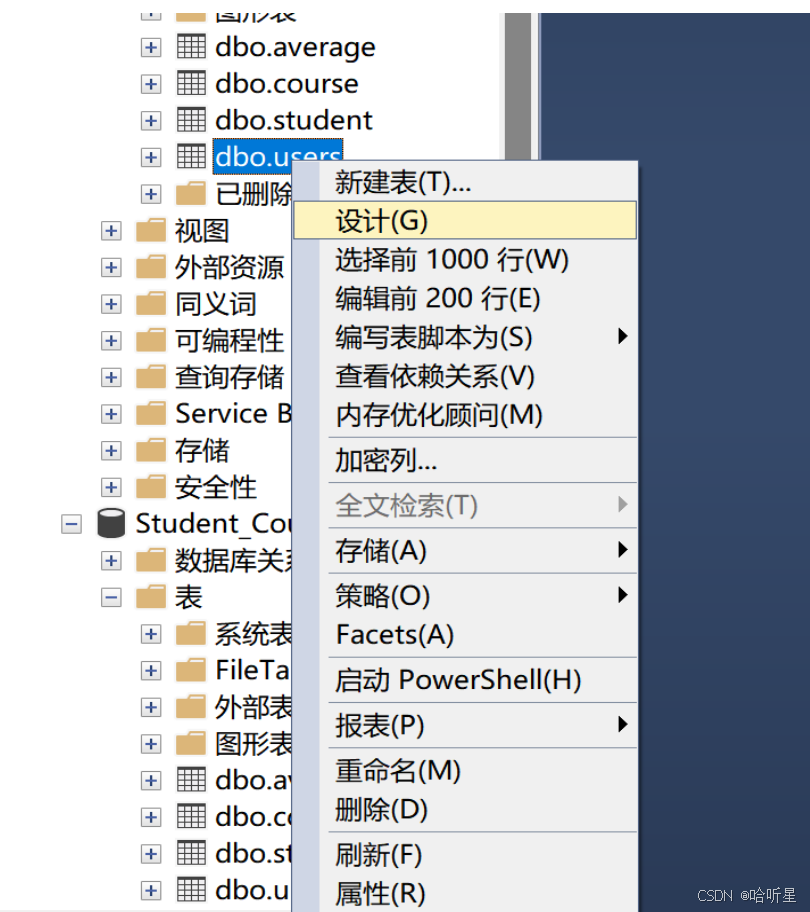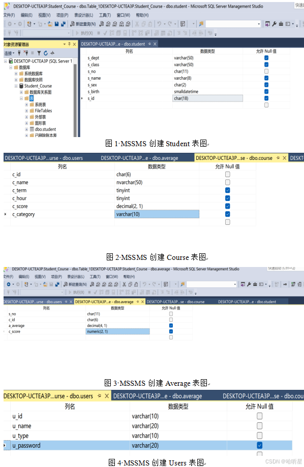 1.学会表的设计、掌握表的构成要素、表的列级约束、表的表级约束及表结构的列表描述---逻辑刻画;使用MSSMS的对象资源管理器以菜单命令方式创建student表、course表、average表、user表(见《SQL Server 2012 数据库基础及应用》第62页-第66页)