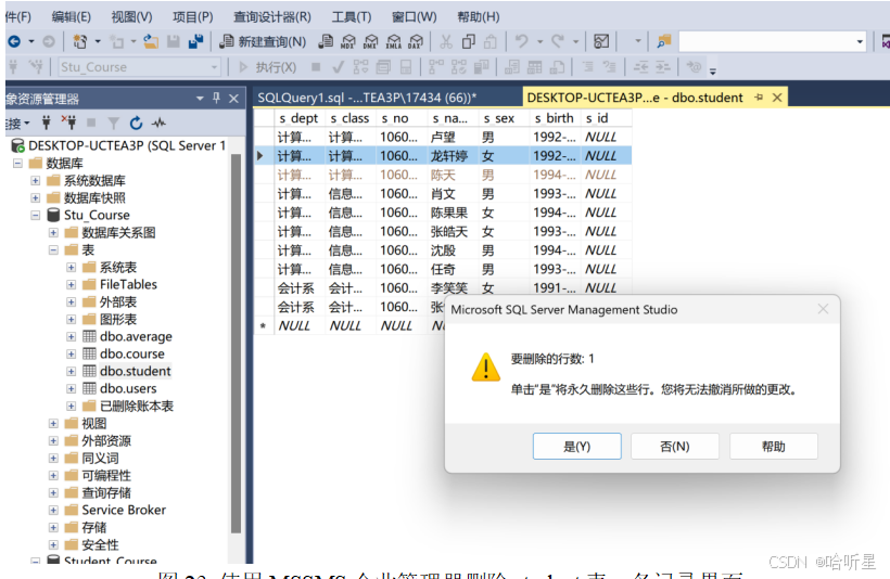 图23 使用MSSMS企业管理器删除student表一条记录界面